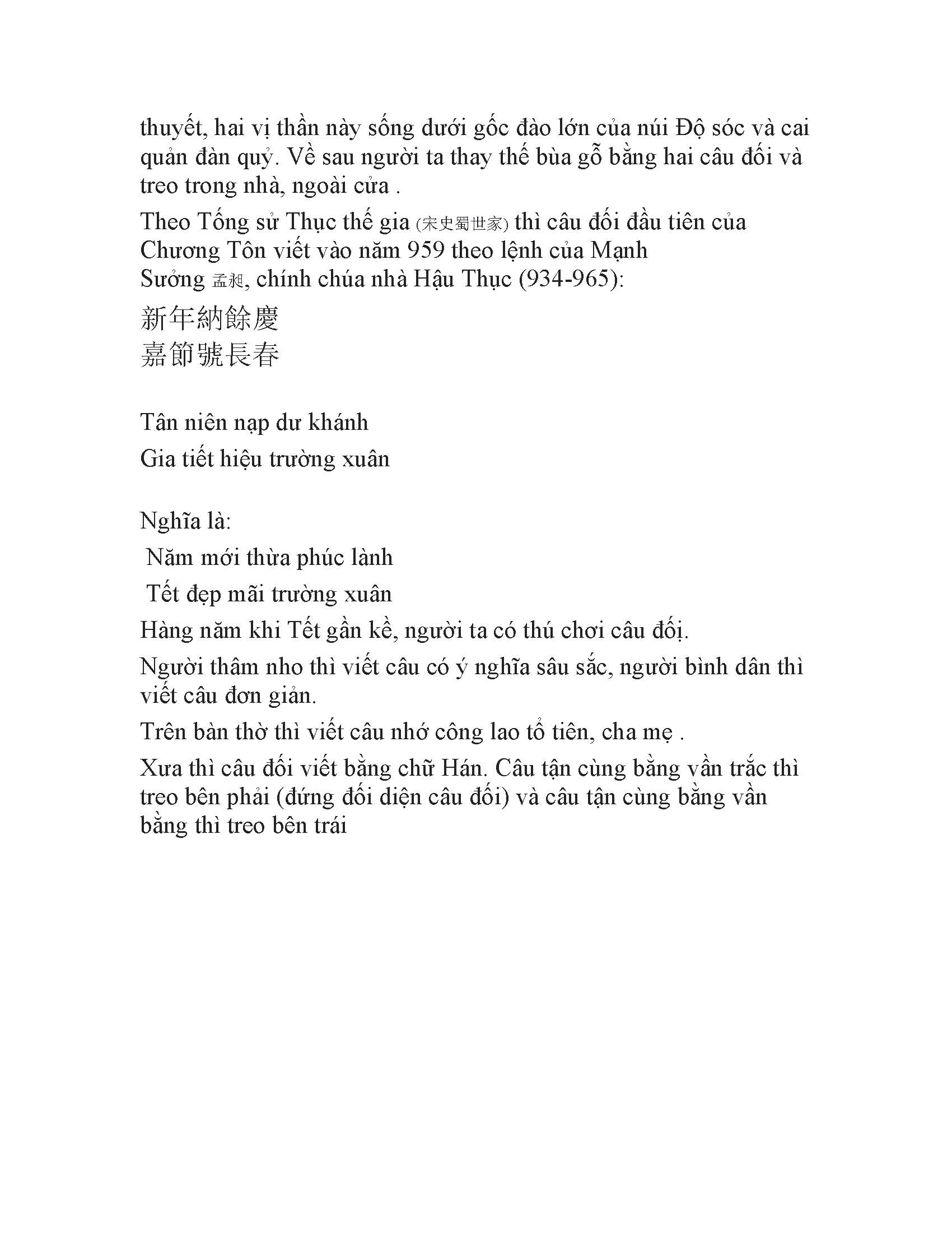 Câu đối là phong tục của người Bách Việt (百越), lãnh thổ ở phía Nam Trung quốc và phía Bắc Việt Nam. Họ treo hai bùa gỗ có hình vị Thần Đồ và thần Uất Luỹ ở hai bên cửa ngõ . Theo truyền thuyết, hai vị thần này sống dưới gốc đào lớn của núi Độ sóc và cai quản đàn quỷ. Về sau người ta thay thế bùa gỗ bằng hai câu đối và treo trong nhà, ngoài cửa .