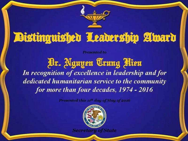 Bằng tưởng thưởng Lãnh Đạo Ưu Tuyển - Trước khi trao bằng tưởng thưởng Lãnh Đạo Ưu Tuyển năm 2016, Ông Bộ Trưởng Nội Vụ đã giới thiệu học vị, việc làm và các công tác xã hội thiện nghĩa mà Huynh Trưởng Nghĩa Sinh, một nhà giáo Việt tại Chicago, đã thực hiện trên 4 thập kỷ.Chicago: Bộ Trưởng Bộ Nội Vụ trao bằng tưởng thưởng “Lãnh Đạo Ưu Tuyển” cho một nhà giáo người Việt ngày 11/05/2016 tại Trung tâm Thống Đốc James
