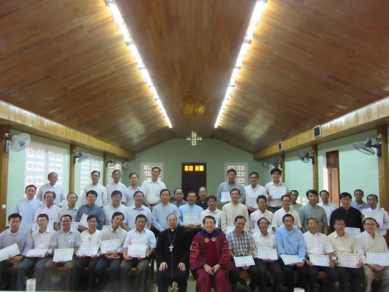 Hình: Quý Cha hiện diện trong Nghi thức Đúc kết Khóa Thường huấn 2016. Quý Cha ở vùng sâu, vùng xa phải về sớm để dâng lễ Chúa Nhật nên không thể tham dự Nghi thức Đúc kết khóa học được.