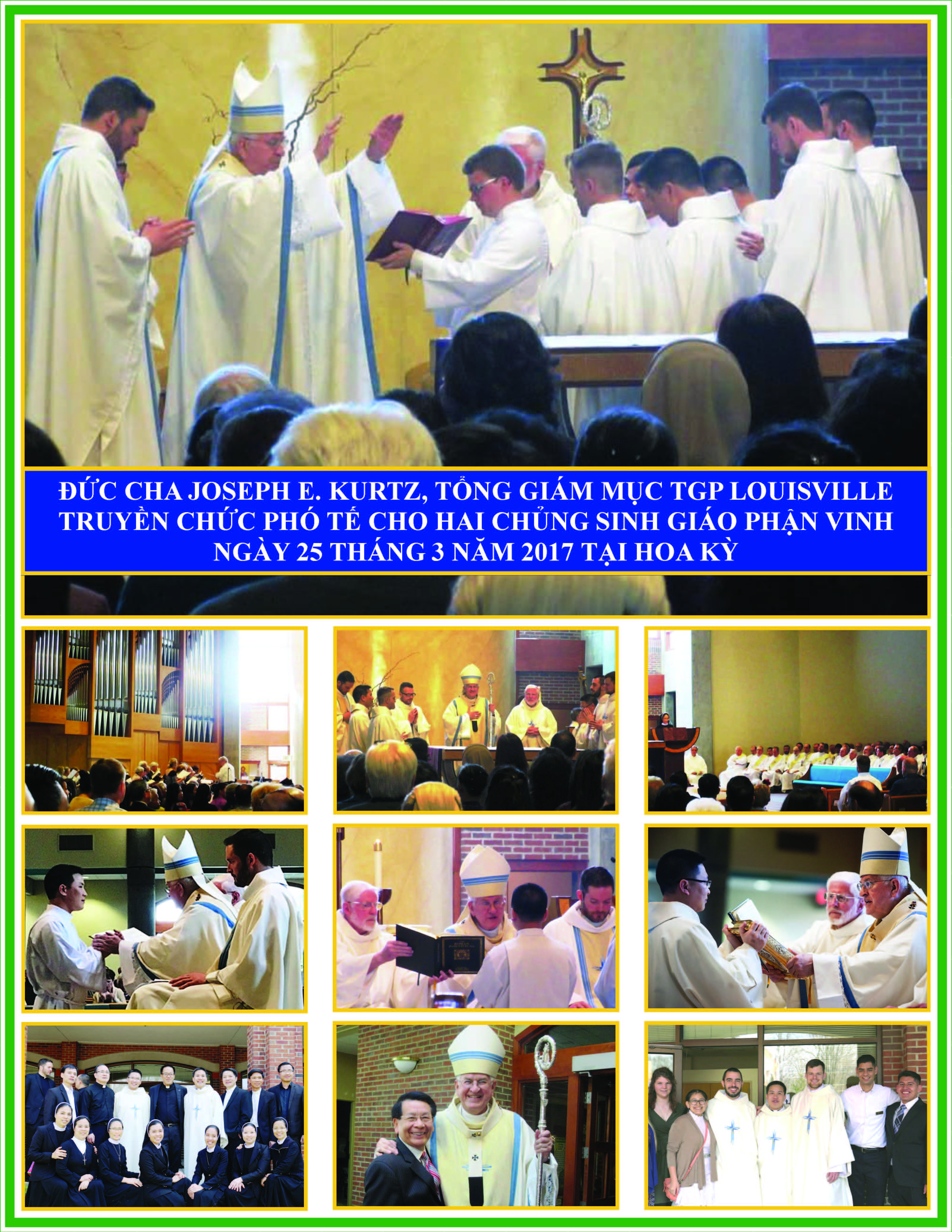 ĐTGM Joseph E. Kurtz đã đến chủ sự Thánh lễ truyền chức vào lúc 10 giờ ngày 25-3-2017 tại Thánh đường Saint Margaret Mary tại Thành phố Louisville, Hoa Kỳ. Cùng đồng tế với ĐTGM có quý Cha trong và ngoài Tổng Giáo phận Louisville. Hơn 700 giáo sĩ, tu sĩ và giáo dân cùng quý thân nhân của các tiến chức đã sốt sắng về tham dự ngày đại lễ.