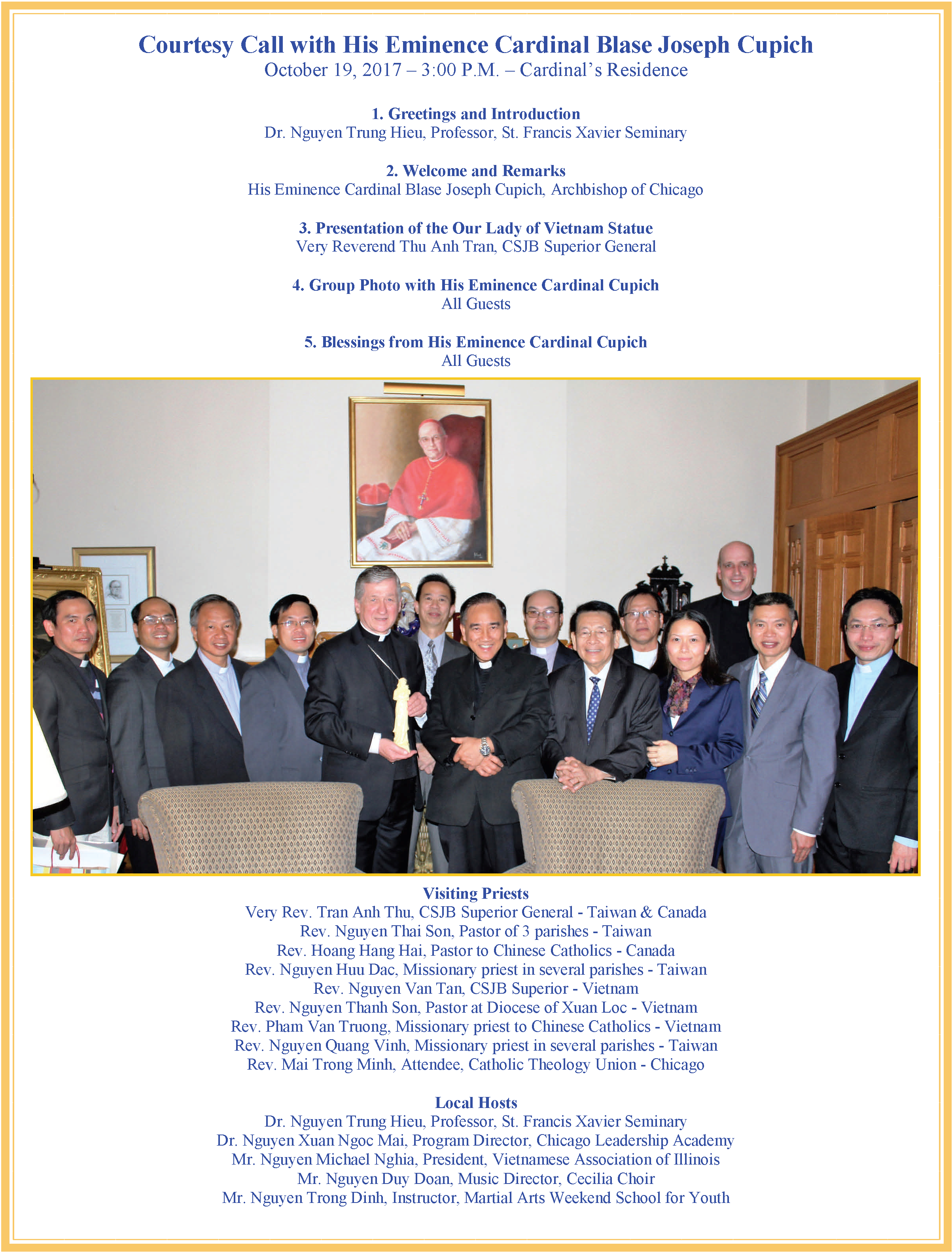 Đức Hồng Y Blase J. Cupich, Tổng Giám Mục Chicago, tiếp kiến phái đoàn Việt Nam gồm Lm. Trần Anh Thư, Bề trên Tổng quyền Hội dòng St. John the Baptist (CSJB) tại Taiwan, Vietnam, Canada, United States, Italy cùng với quý Cha Bề trên và các Cha xứ thuộc Hội dòng CSJB và quý chức VN tại Chicago.