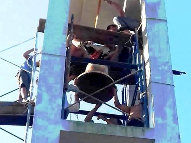 Hình trên: Quý nghệ nhân trong xứ đang chuyển treo và bảo quản trên tháp chuông.