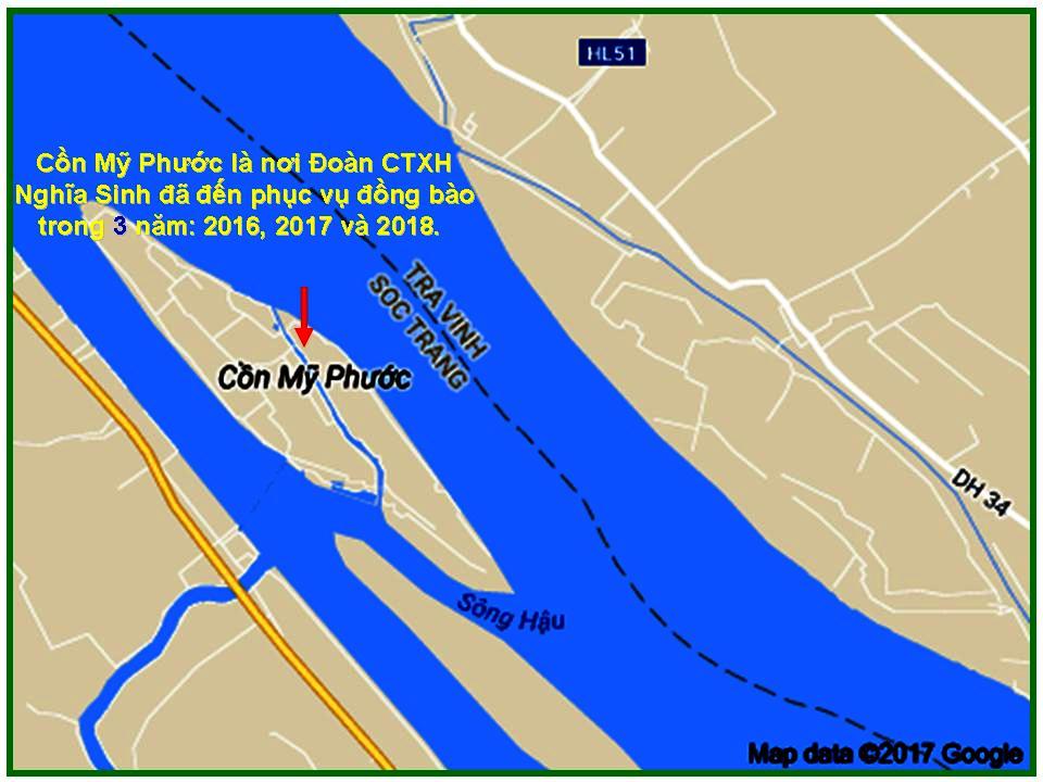 Cồn Mỹ Phước là nơi Đoàn CTXH Nghĩa Sinh đã đến phục vụ đồng bào trong 3 năm: 2016, 2017 và 2018. Photograph by Map data@2017 Google.
