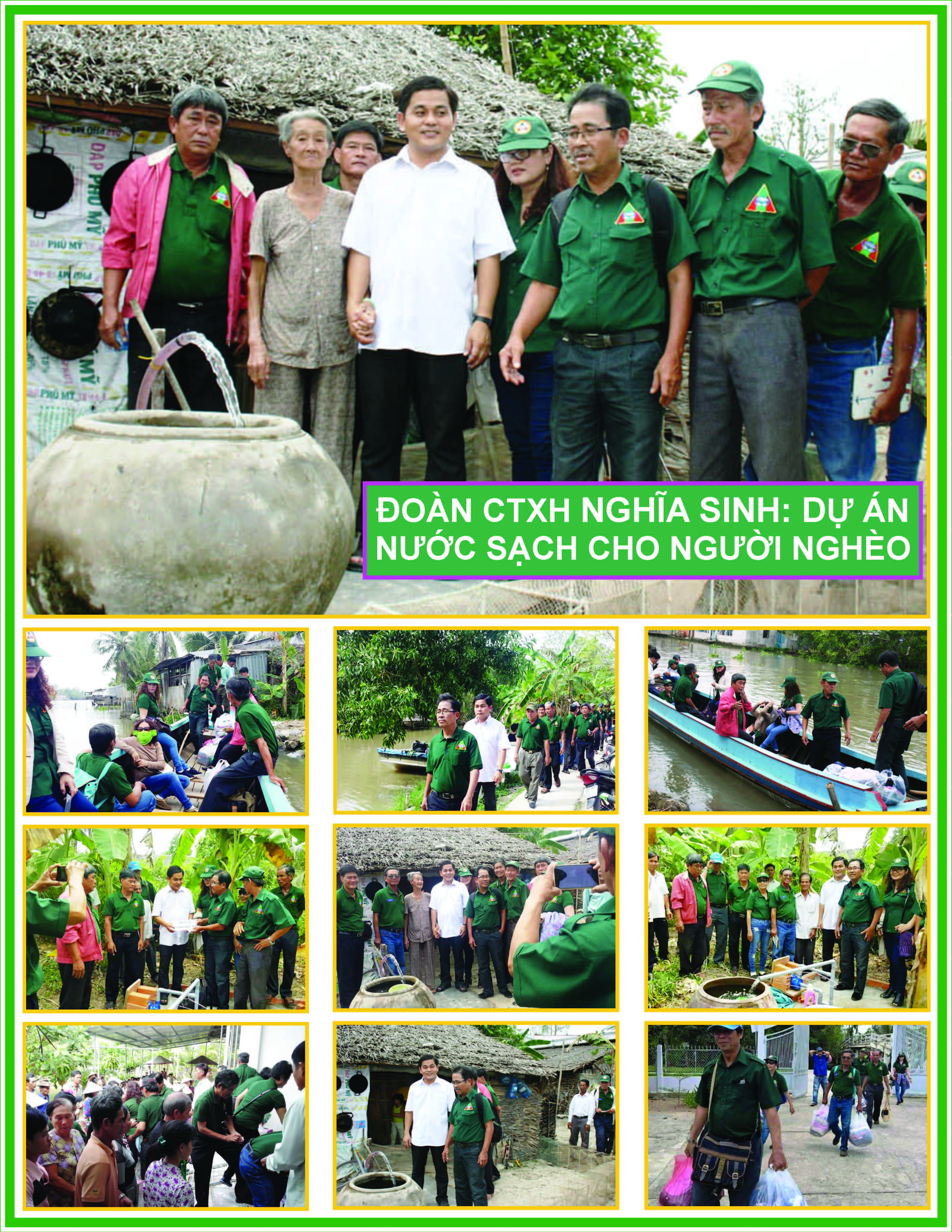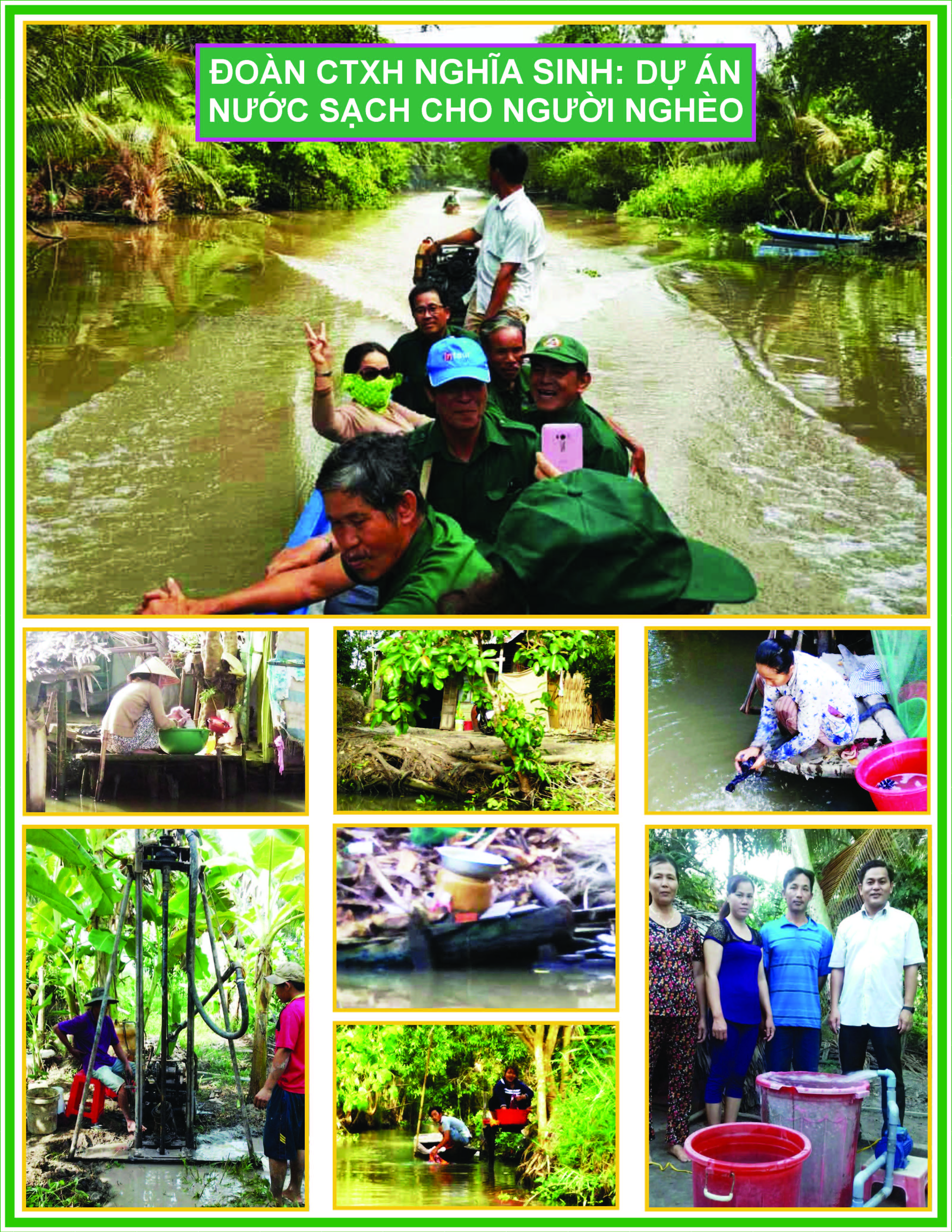 Hình trên: Đoàn CTXH Nghĩa Sinh đang nghiệm thu các giếng nước uống và phân phối các phần quà cho đồng bào nghèo.