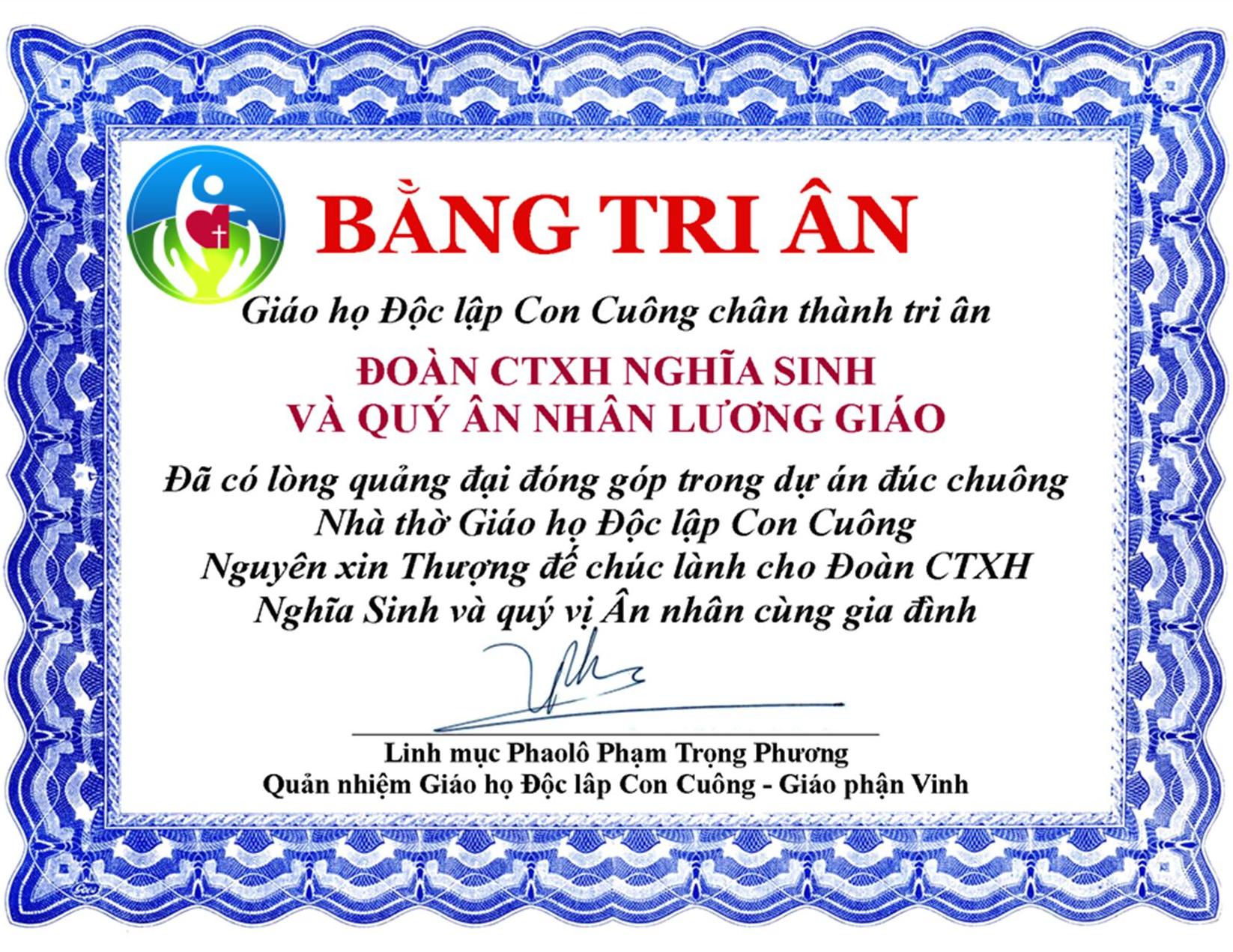 Trong dịp nầy, Cha Quản nhiệm Nhà thờ Con Cuông đã có mỹ ý đến thăm Đoàn CTXH Nghĩa Sinh và trao tặng Bằng Tri Ân để cảm ơn Đoàn CTXH và quý ân nhân lương giáo đã giúp đúc chuông nhà thờ và trao tặng cho Giáo họ Độc lập Con Cuông.