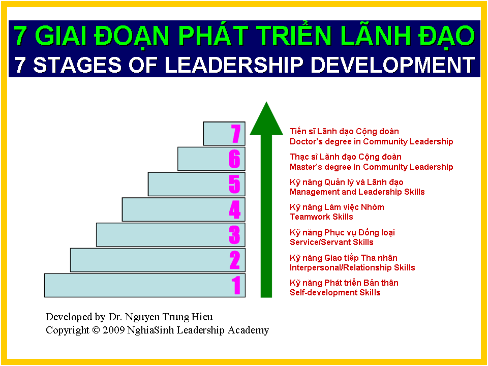 * Mỗi sinh viên tự mua một sách giáo khoa do thầy chỉ định - bao gồm bài học, bài tập và bài kiểm để nạp cho thầy. Trước khóa học thầy cho thi trắc nghiệm trình độ và sau khi hoàn tất khóa học thầy cũng cho thi cùng bài trắc nghiệm để đo lường thành quả của khóa học (B–A=C).Lớp Thạc sĩ Lãnh đạo Phục vụ: 20 sinh viên được đại học chào đón và Nghĩa Sinh đồng hành từ Hanoi, Saigon, Kontum, Vinh và Hà Tĩnh