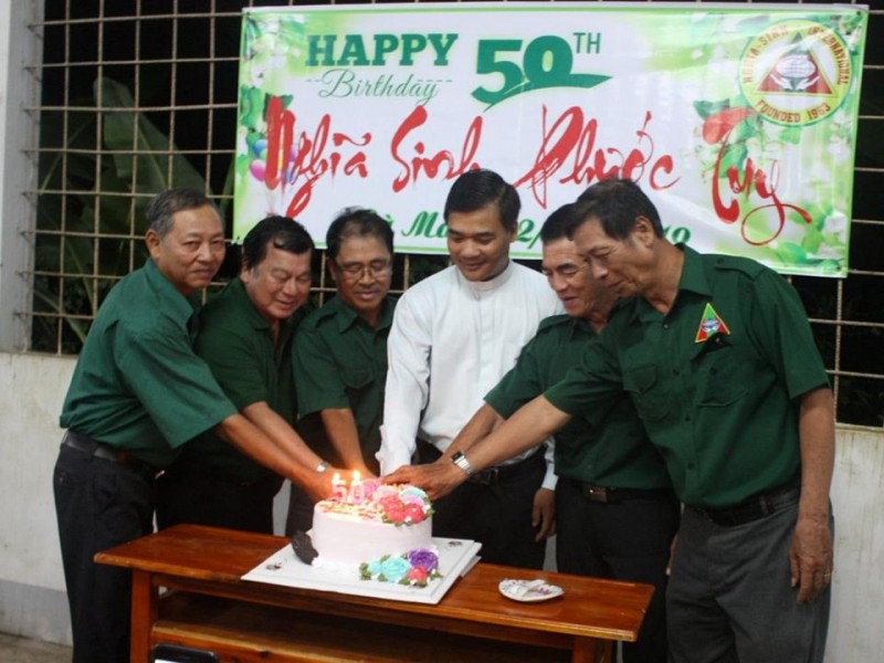 Linh mục Quản xứ đã cắt bánh mừng sinh nhật thứ 50 của Nghĩa Sinh Phước Tuy và khai mạc tiệc mừng do Hội đồng Mục vụ Giáo xứ hỗ trợ nhân lực đảm trách ẩm thực và thiết đãi mọi người thức ăn đặc sản Cà Mau thơm ngon và đượm tình quê hương. Trong dịp nầy Cha Đaminh đã nhiệt tình khen ngợi tinh thần kiên định phục vụ đồng hương của Phương Đoàn Nghĩa Sinh Phước Tuy trong hơn nửa thế kỷ qua – với tấm lòng thiện nghĩa và hy sinh. Các thành viên trong đoàn công tác tự trả tiền xe di chuyển và tự đài thọ thức ăn để tham dự đoàn công tác xã hội. Một trăm phần trăm tiền hỗ trợ của Ân nhân Nghĩa Sinh đều được chuyển tặng trực tiếp đến tận tay đồng bào và các cơ sở từ thiên bác ái.Hội đồng Huynh trưởng Nghĩa Sinh: Kỷ niệm 50 năm thành lập và hoạt động bác ái từ thiện của Phương đoàn Nghĩa Sinh Phước Tuy * 1969-2019
