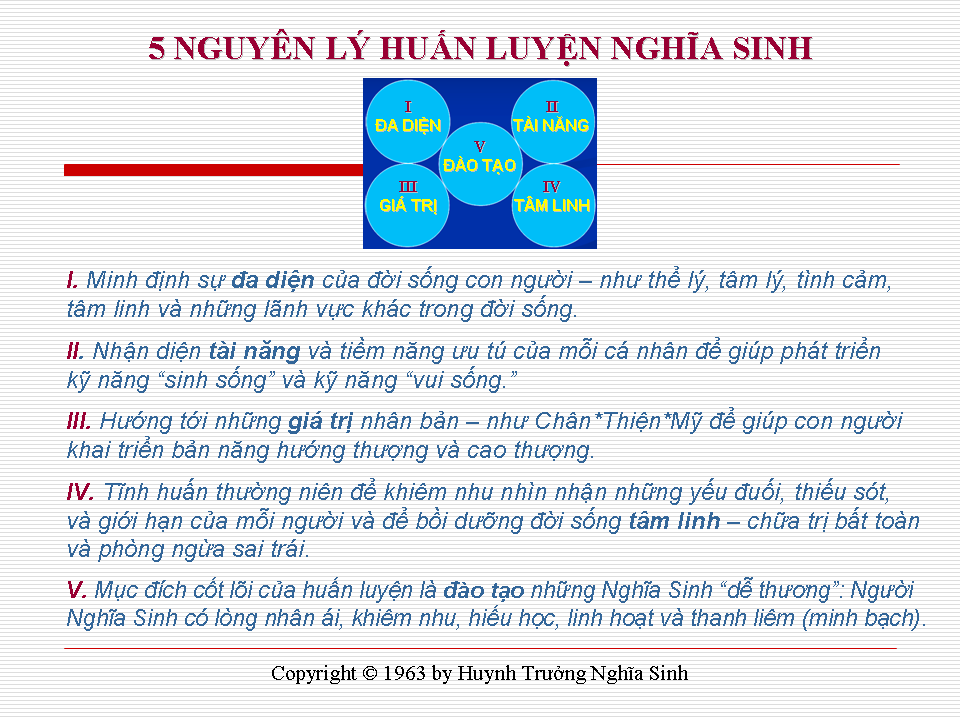 5. Mục đích cốt lõi của huấn luyện là đào tạo những Nghĩa Sinh “dễ thương”: Người Nghĩa Sinh có lòng nhân ái, khiêm nhu, hiếu học, linh hoạt và thanh liêm (minh bạch).