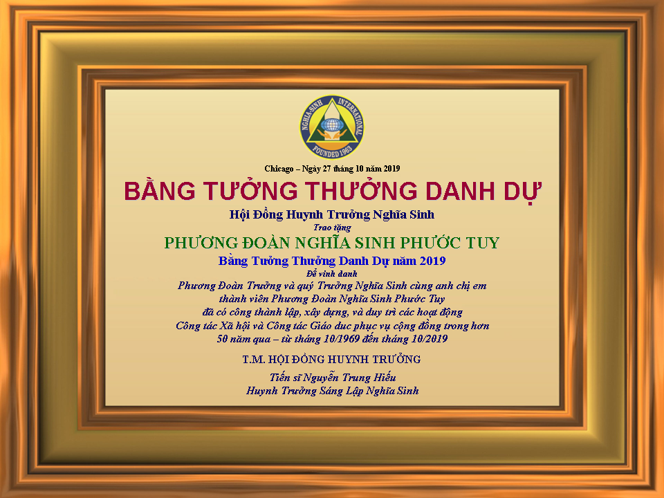 Nhân dịp kỷ niệm 50 năm thành lập Phương Đoàn Nghĩa Sinh Phước Tuy, Hội Đồng Huynh Trưởng Nghĩa Sinh đã gởi lời nồng nhiệt chúc mừng Sinh nhật thứ 50 của Phương Đoàn Nghĩa Sinh Phước Tuy và trao tặng Bằng Tưởng Thưởng Danh Dự năm 2019 với nội dung sau đây: