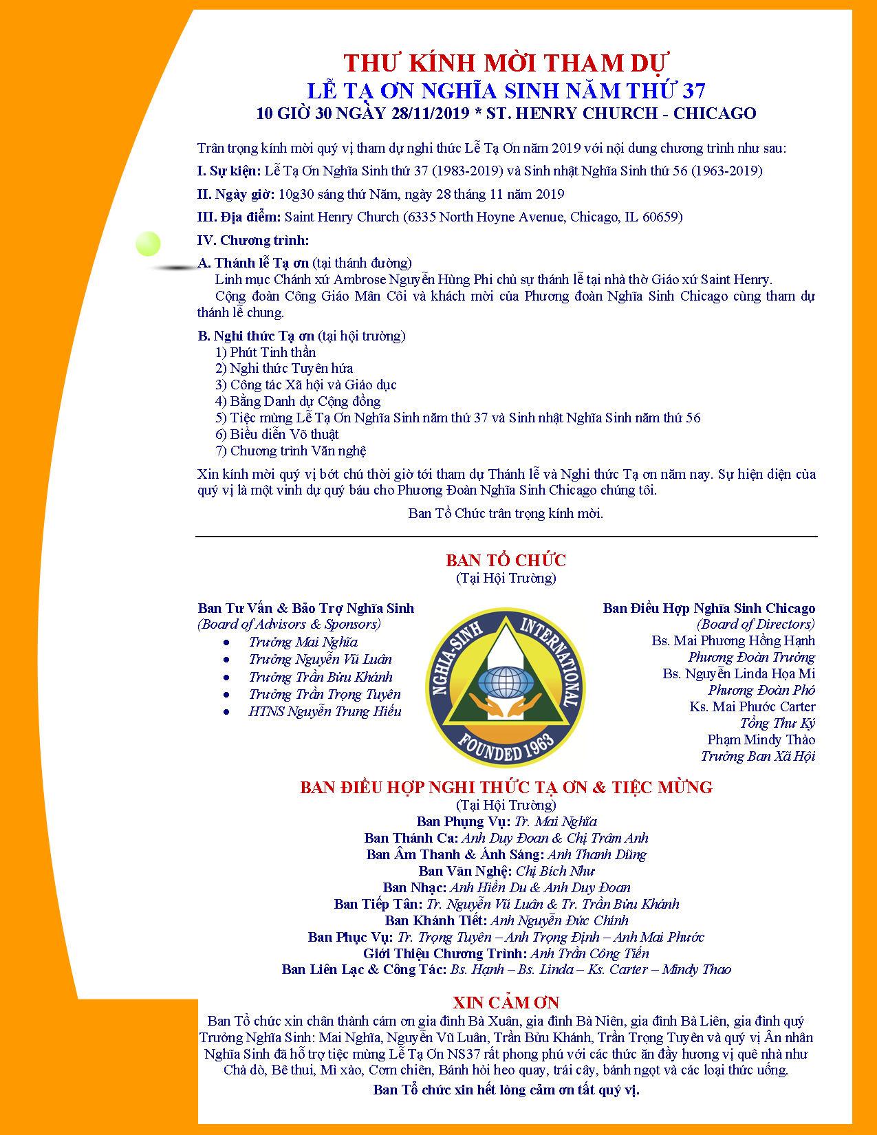 2. Nghi thức Tạ ơn (tại hội trường) bao gồm tuyên hứa, công tác, biểu diễn võ thuật, trình diên văn nghệ và tiệc mừng Lễ Tạ Ơn.Thư mời Lễ Tạ Ơn Nghĩa Sinh năm thứ 37 tại Giáo xứ St. Henry Chicago ngày 28/11/2019