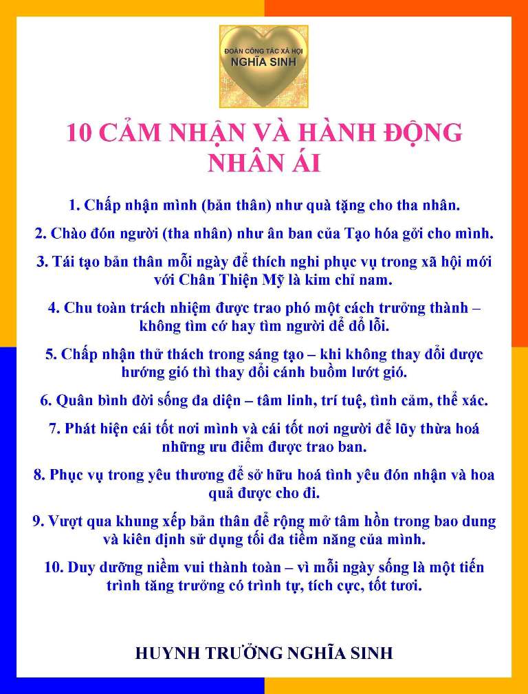 10 Cảm nhận và Hành động Nhân ái trong công tác xã hội bác ái và công tác giáo dục đào tạo trong Tổ chức Nghĩa Sinh.
