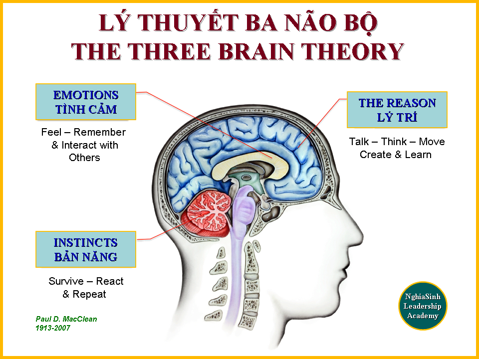 Theo nghiên cứu của Bác sĩ Paul MacLean trong thập niên 1960s, mỗi người chúng ta có một khối óc nhưng có ba não bộ thông minh – dựa theo Lý thuyết ba não bộ (Three brain theory) của tác giả như sau.
