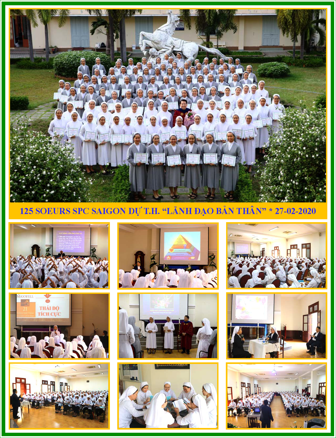 Là những nhà lãnh đạo thánh thiện và có nhiều năm kinh nghiệm trong lãnh vực giáo dục, quý Soeurs Tỉnh dòng SPC Saigon trong khóa học đã khiêm nhu tham dự hội học (3 tiết buổi sáng), hội thảo (3 tiết buổi chiều) và thực tập (1.5 tiết theo tổ) để hoàn tất 30 tiết học lý thuyết và thực hành về chủ đề Lãnh đạo Bản thân. Người viết xin được bày tỏ lòng cảm phục và trân trọng tới quý Soeurs.
