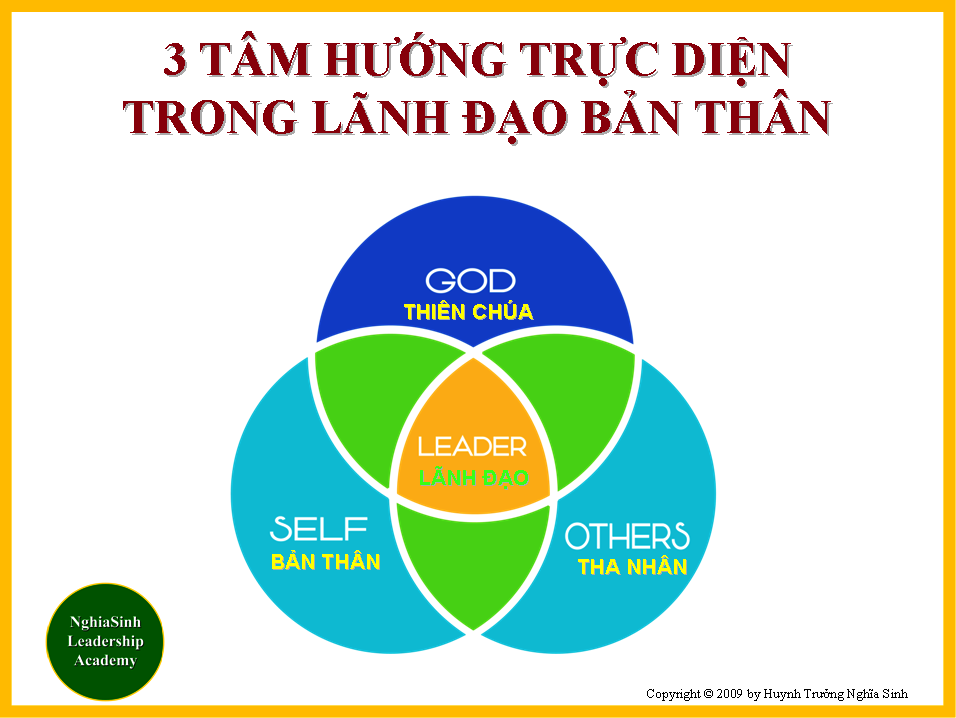 Lãnh đạo Bản thân (LĐBT) bắt đầu với tiền đề đơn giản là mình không thể nào thành công trong việc giúp đỡ và hướng dẫn người khác nếu mình không thể tự quản lý được chính mình. Nếu muốn hướng dẫn người khác hiệu quả, trước tiên chúng ta cần phải có khả năng lãnh đạo bản thân hiệu quả. LĐBT là bồi dưỡng kiến thức và trau dồi kỹ năng dẫn dắt chính mình. Tự lãnh đạo là lúc chúng ta “tiếp xúc” với bản thân mình một cách trung thực như khi “xét mình” để nhận diện bản thân: ưu điểm và khuyết điểm; sở trường và sở đoản; tiềm năng và giới hạn; tự tin nhưng không tự cao, tự đại – biết khiêm nhường nhìn nhận sự mỏng dòn của thân xác. LĐBT là một tiến trình sàng lọc để những gì tích cực sẽ được bảo trọng và phát triển, và những gì tiêu cực sẽ được rời xa và vĩnh biệt để dồn nỗ lực trong 3 tâm hướng: (1) Cải thiện bản thân; (2) Giúp ích tha nhân; và (3) Phụng sự Thiên Chúa.