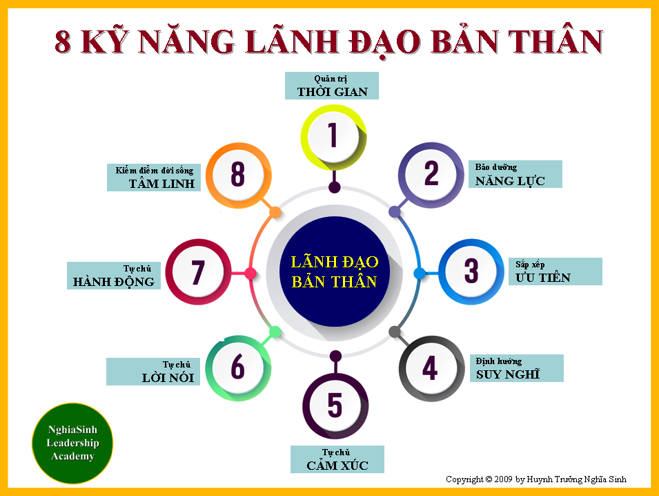 Một người am tường về lãnh đạo bản thân cần học hỏi và thực hành thông suốt 8 kỹ năng lãnh đạo bản thân sau đây.