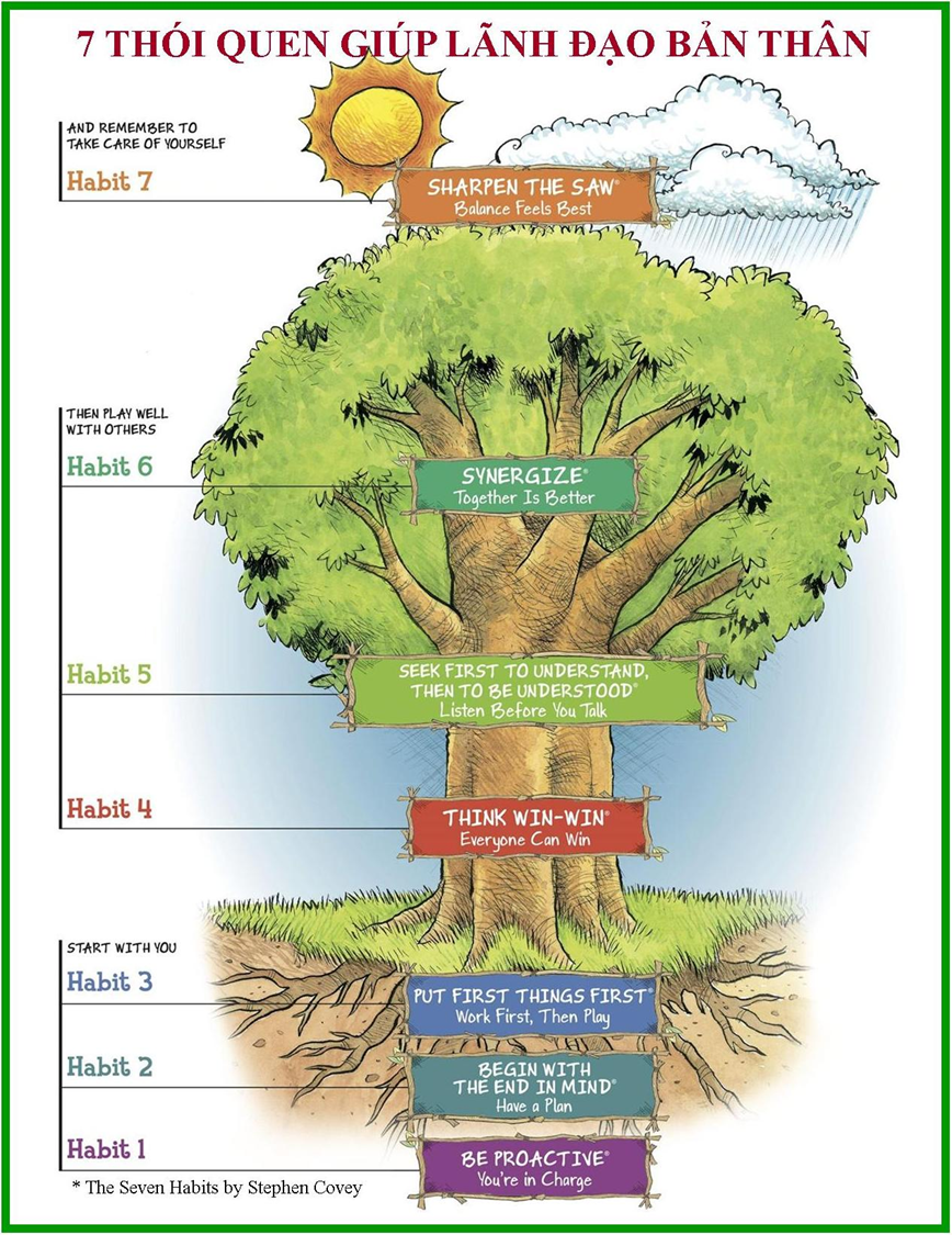 4. Những thói quen giúp thành công (habits for success) – Để mỗi người tự luyện tập những thói quen tốt đẹp giúp ta thành công (như tích cực chủ động, biết rõ mục tiêu, sắp xếp ưu tiên, thực hiện “cùng thắng”, biết người biết mình, đồng tâm hiệp lực, bồi dưỡng bản thân).
