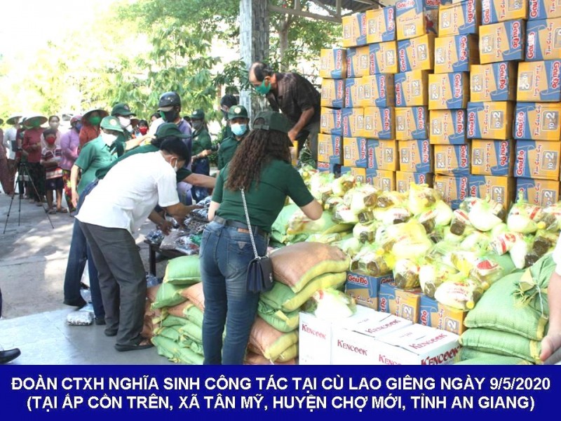 Trong tuần lễ đầu tiên ở Việt Nam được dừng cách ly xã hội, Đoàn Công tác Xã hội Nghĩa Sinh đã đến Ấp Cồn Trên ở Cù Lao Giêng (thuộc Xã Tân Mỹ, Huyện Chợ Mới, Tỉnh An Giang) để chào thăm đồng bào và tặng quà cho bà con gia đình nghèo khổ trong mùa dịch bệnh Covid-19. Hơn 100 gia đình có hoàn cảnh khó khăn đã đến tiếp nhận một phần quà nghĩa tình. Mỗi phần quà trị giá 250.000 VNĐ bao gồm gạo, mỳ và các nhu yếu phẩm khác. Trong dịp nầy Đoàn cũng đã phát khẩu trang, gel diệt khuẩn và nhắc nhở đồng bào giữ đúng cự ly theo hướng dẫn của Bộ Y Tế trong thời gian bà con nhận quà. Đoàn lên đường công tác ngày 8/5, thực hiện công tác ngày 9/5 và tạm biệt đồng hương trở về sau công tác ngày 10/5/2020. Trong tình thần yêu thương “lá lành đùm lá rách,” Đoàn CTXH Nghĩa Sinh đã lên dường hỗ trợ những người gặp khó khăn trong mùa dịch bệnh Covid-19.