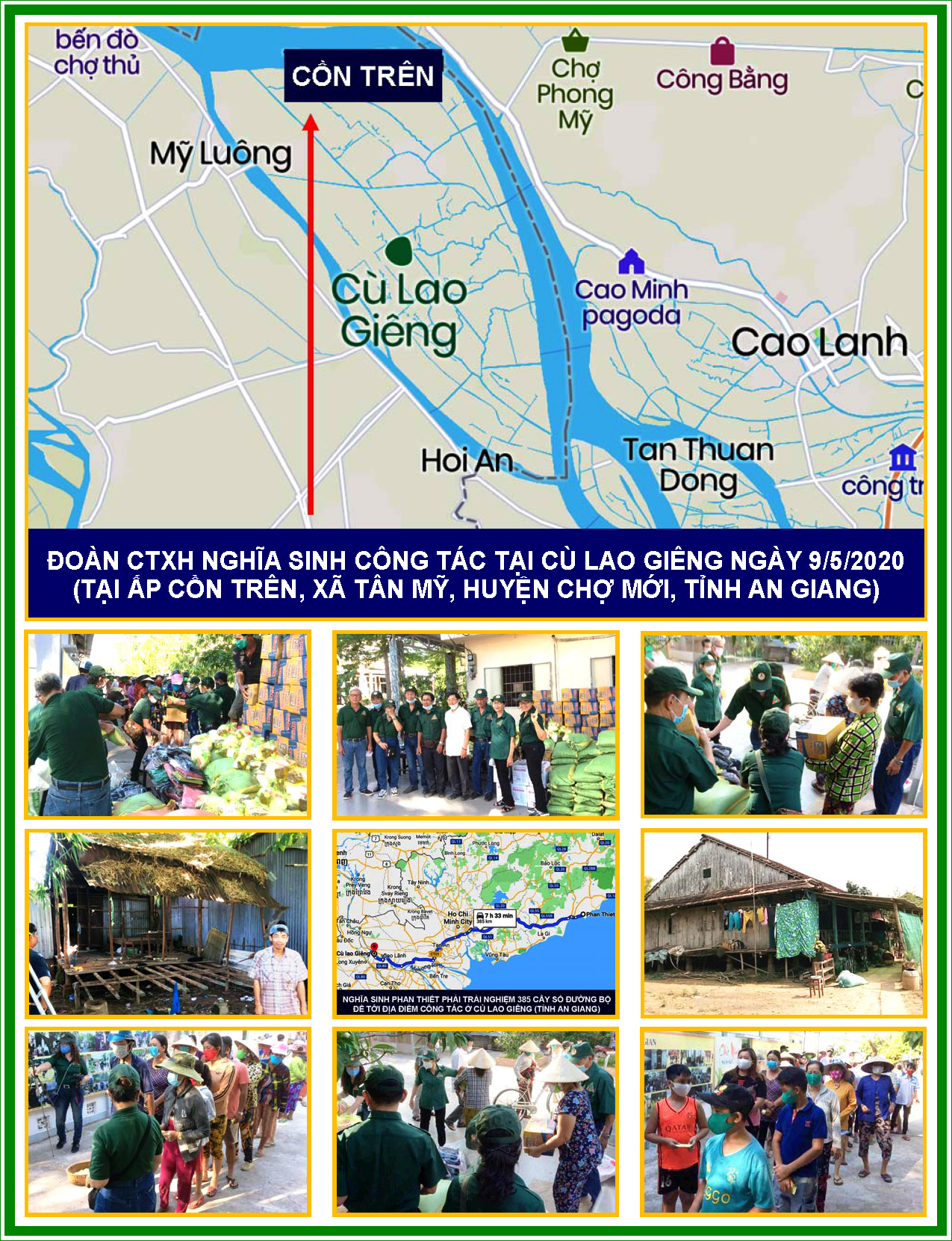 ĐOÀN CTXH NGHĨA SINH - Địa điểm Nghĩa Sinh đến công tác kỳ nầy là Cù Lao Giêng cách Saigon 186 cây số, cách Phước Tuy 267 cây số và như vậy Nghĩa Sinh Phan Thiết đã phải trải nghiệm 384 cây số đường trường để tới nơi công tác. Quý danh của các thành viên trong Đoàn CTXH Nghĩa Sinh từ Phan Thiết, Phước Tuy và Sài Gòn gồm có các Trưởng và Nghĩa Sinh sau đây (tên xếp theo thứ tự alpha): Trưởng Nguyễn Hồng Lam, Trưởng Ngũ Phùng Vân, Hoàng Văn Tám, Nguyễn Quỳnh [BAVH], Nguyễn Thị Bích, Nguyễn Thị Hiền, Nguyễn Xuân Thu [NS Phan Thiết], Nguyễn Xuân Thu [NS Phước Tuy], Phạm Thu Loan và Xuân Lê [Ban Truyền Thông Đoàn CTXH].Dịch bệnh COVID-19: Nghĩa Sinh từ Phan Thiết, Phước Tuy và Sài Gòn giúp đỡ đồng bào nghèo khổ tại Cù Lao Giêng sau thư dãn cách ly xã hội