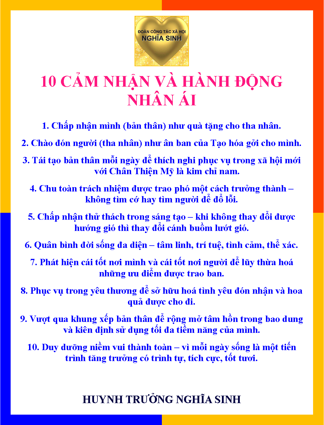 Hình trên: Nghĩa Sinh luôn luôn nhất quán tuân thủ các tiêu chí hoạt động, "10 Cảm nhận và Hành động Nhân ái", trong tất cả các dự án Công tác Xã hội Từ thiện và Công tác Giáo dục Đào tạo do Nghĩa Sinh trách nhiệm tổ chức và điều hành trong 57 năm qua (1963-2020).