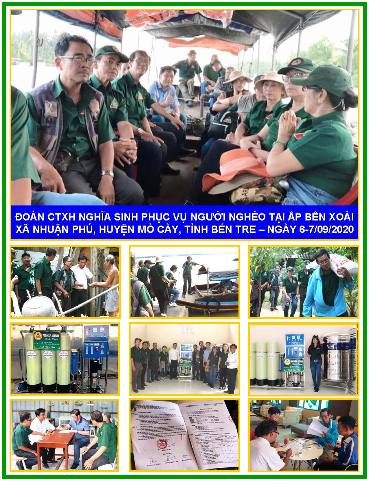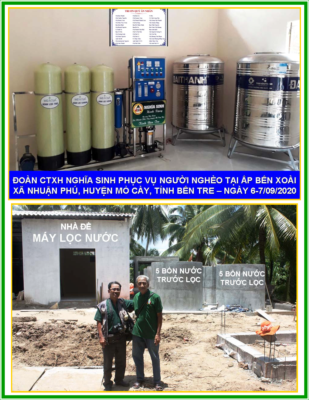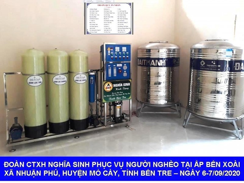 CÁC DỰ ÁN “NƯỚC SẠCH CHO NGƯỜI NGHÈO” - Sau khi được biết đại dịch Covid-19 đã dẫn đến thảm cảnh là nhiều gia đình phải dùng nước sông cho mọi việc hàng ngày: ăn uống, tắm giặt, vệ sinh… Vì vậy Đoàn CTXH Nghĩa Sinh đã hợp tác với quý chức lãnh đạo tinh thần địa phương để thực hiện dự án “Lọc Nước Sông thành Nước Sạch cho Người Nghèo” tại một vùng sâu vùng xa – nhằm giúp bà con có nước sạch miễn phí để dùng hàng ngày tại Cù lao Bến Xoài, xã Nhuận Phú, huyện Mỏ Cày, tỉnh Bến Tre.Hội Đồng Huynh Trưởng Nghĩa Sinh: Dự án “Lọc Nước Sông thành Nước Sạch cho Người Nghèo” tại Cù lao Bến Xoài, Mỏ Cày, Bến Tre do Đoàn CTXH Nghĩa Sinh thực hiện ngày 6 và 7/9/2020