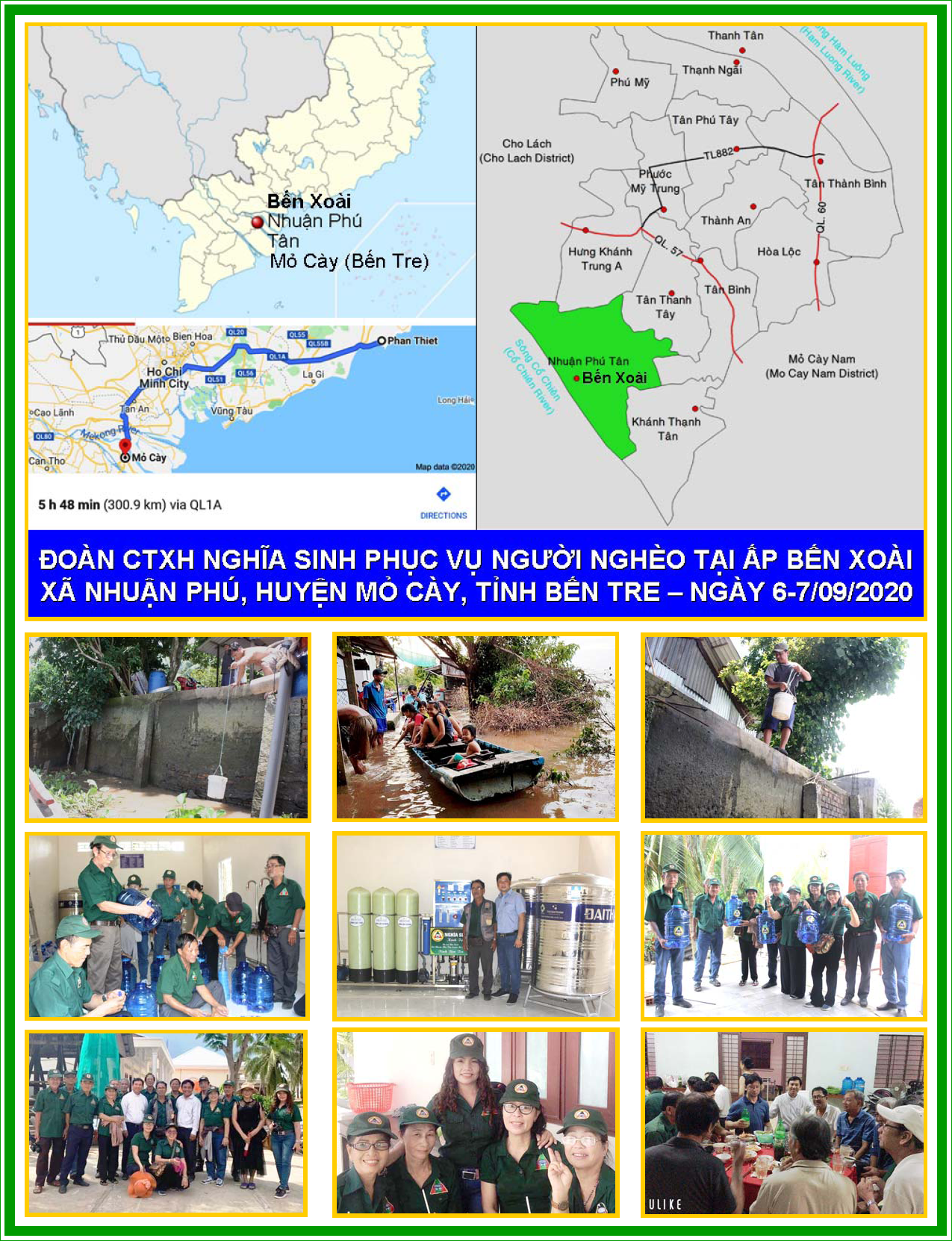 Có 15 đại diện Nghĩa Sinh – thuộc 4 Phương đoàn Nghĩa Sinh: Phước Tuy, Phan Thiết, Sài Gòn và Thủ Đức – đã tham dự chuyến CTXH tại Bến Xoài, Mỏ Cày (Bến Tre) trong hai ngày 6 và 7 tháng 9 năm 2020.