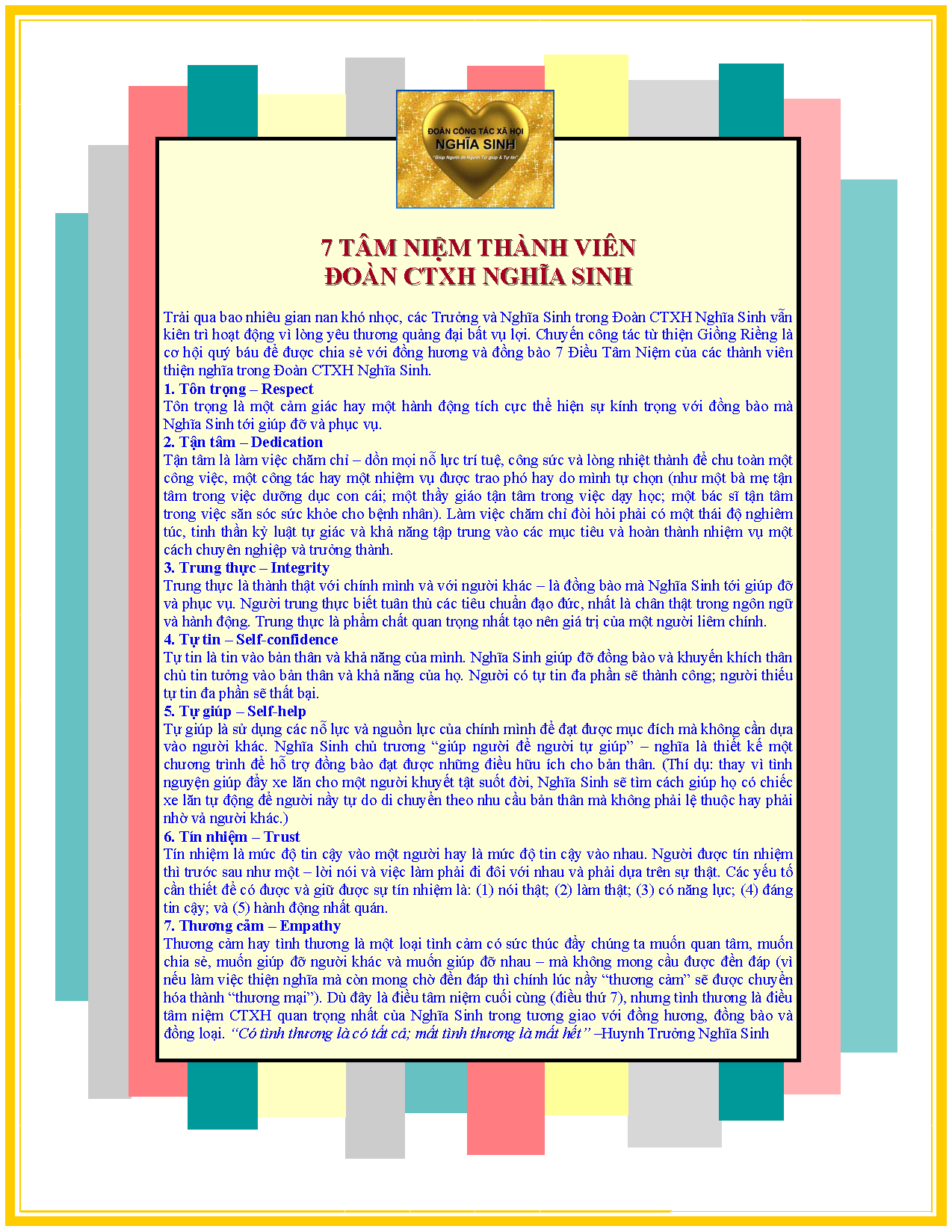 Đại đa số các Trưởng và Nghĩa Sinh tham dự chuyến công tác nầy đều đã gia nhập Nghĩa Sinh cách nay hơn 50 năm – đã hơn nửa thế kỷ phục vụ đồng hương, đồng bào và đồng loại trong tinh thần thiện nghĩa và hoàn toàn tự nguyện – rất đáng trân trọng và khâm phục. Bảy (7) Tâm niệm Thành viên Đoàn CTXH Nghĩa Sinh đã được minh bạch và nghiêm túc thực hiện trong hơn 57 năm qua (1963-2020) được ghi nhận như sau: