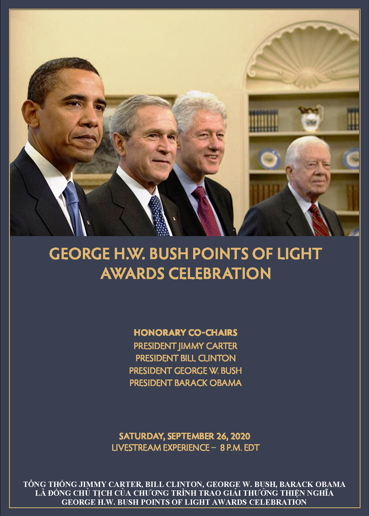 [1] Mạng lưới toàn cầu “Tụ quang Tỏa sáng” (Points of Light) do cố Tổng thống George W.H. Bush sáng lập cách nay hơn 30 năm (1990-2020).