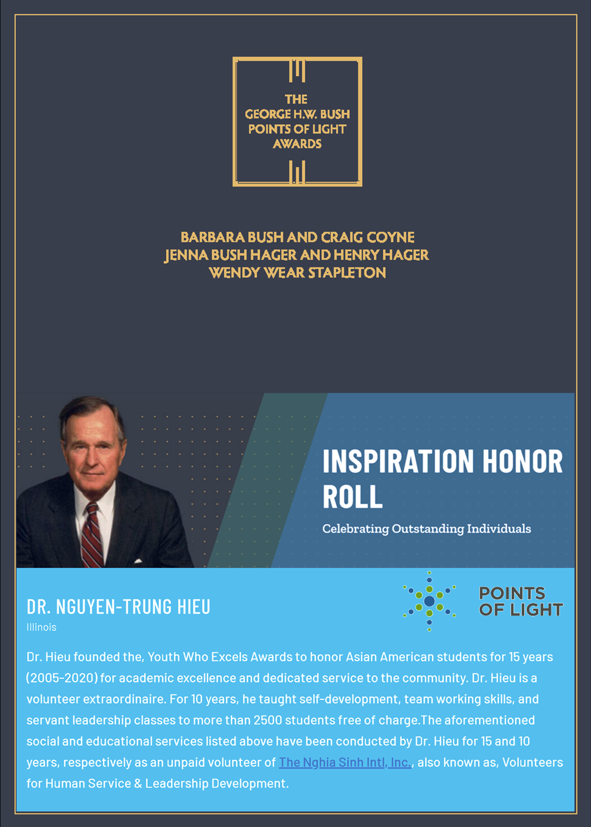 Nhân danh Tổ chức Nghĩa Sinh, Huynh Trưởng Nguyễn Trung Hiếu đã thiết lập giải thưởng “Thanh niên Ưu tú”[2] năm 2005 để tưởng thưởng những người trẻ gốc Á châu tại Chicago, Hoa Kỳ có trình độ học thức xuất sắc và tận tâm phục vụ cộng đồng trong tinh thần thiện nghĩa. Trong 15 năm qua – từ năm 2005 đến 2020 – Ban tổ chức đã tuyển chọn và trao tặng Bằng Tưởng Thưởng “Thanh niên Ưu tú” cho 126 sinh viên học sinh ưu tú từ các cộng đồng Á châu tại Hoa Kỳ như Ấn Độ, Cambodia, Đại Hàn, Lào Quốc, Mã Lai, Nam Dương, Nhật Bản, Pakistan, Tân Gia Ba, Thái Lan, Trung Hoa và Việt Nam. Mục đích cốt lõi của chương trình Tưởng thưởng “Thanh niên Ưu tú” là chuẩn bị giới trẻ đóng vai trò lãnh đạo trong gia đình, tại trường học, nơi làm việc và tự tin đảm nhiệm sứ vụ lãnh đạo cộng đồng một cách thanh liêm và chính trực.