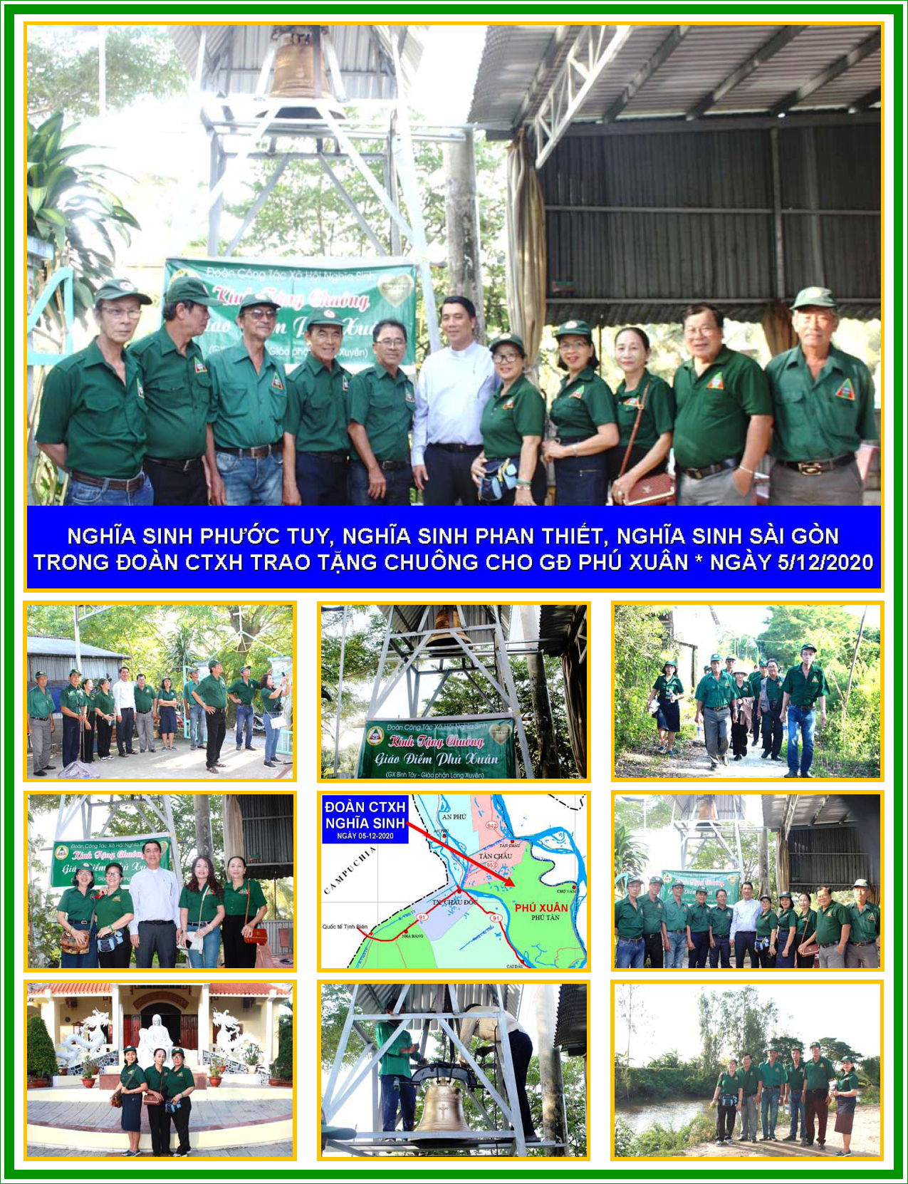 Ngày 05/12/2020: Đoàn CTXH Nghĩa Sinh đã đến thăm đồng bào và dâng tặng chuông nhà thờ tại Giáo điểm Phú Xuân thuộc tỉnh An Giang (Gp. Long Xuyên). Vì quả chuông nặng hơn 160kg (trị giá 62 triệu VND) nên quý Ân nhân Nghĩa Sinh đã hỗ trợ thêm để nâng cấp độ vững chắc lâu bền của tháp chuông.