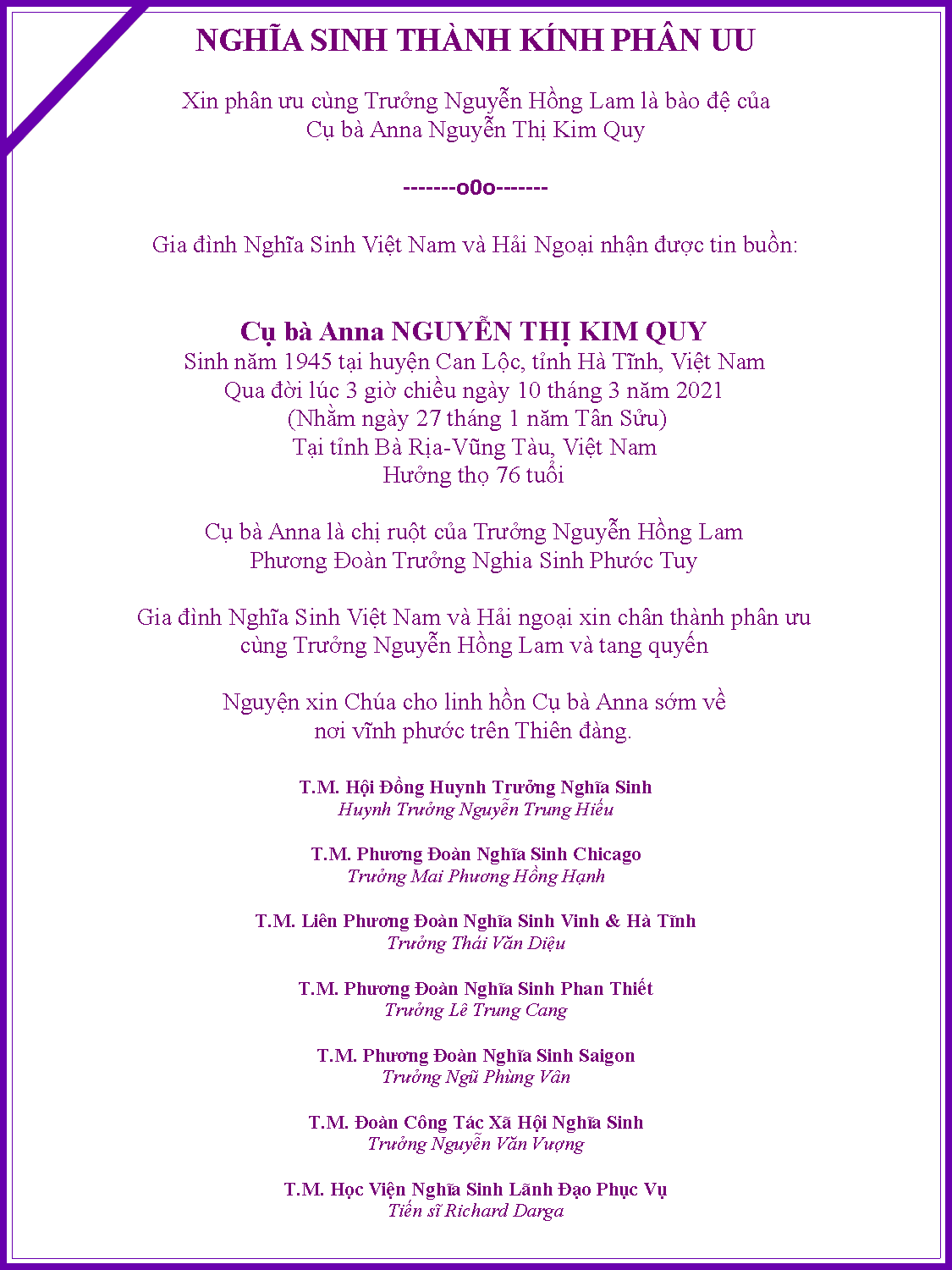 Gia đình Nghĩa Sinh Việt Nam và Hải Ngoại nhận được tin buồn: Cụ bà Anna NGUYỄN THỊ KIM QUY, Sinh năm 1945 tại huyện Can Lộc, tỉnh Hà Tĩnh, Việt Nam. Qua đời lúc 3 giờ chiều ngày 10 tháng 3 năm 2021 (Nhằm ngày 27 tháng 1 năm Tân Sửu) Tại tỉnh Bà Rịa-Vũng Tàu, Việt Nam. Hưởng thọ 76 tuổi. Cụ bà Anna là chị ruột của Trưởng Nguyễn Hồng Lam, Phương Đoàn Trưởng Nghia Sinh Phước Tuy. Gia đình Nghĩa Sinh Việt Nam và Hải ngoại xin chân thành phân ưu cùng cùng Trưởng Nguyễn Hồng Lam và tang quyến. Nguyện xin Chúa cho linh hồn Cụ bà Anna sớm về nơi vĩnh phước trên Thiên đàng. TM. Hội Đồng Huynh Trưởng Nghĩa Sinh đồng phân ưu.