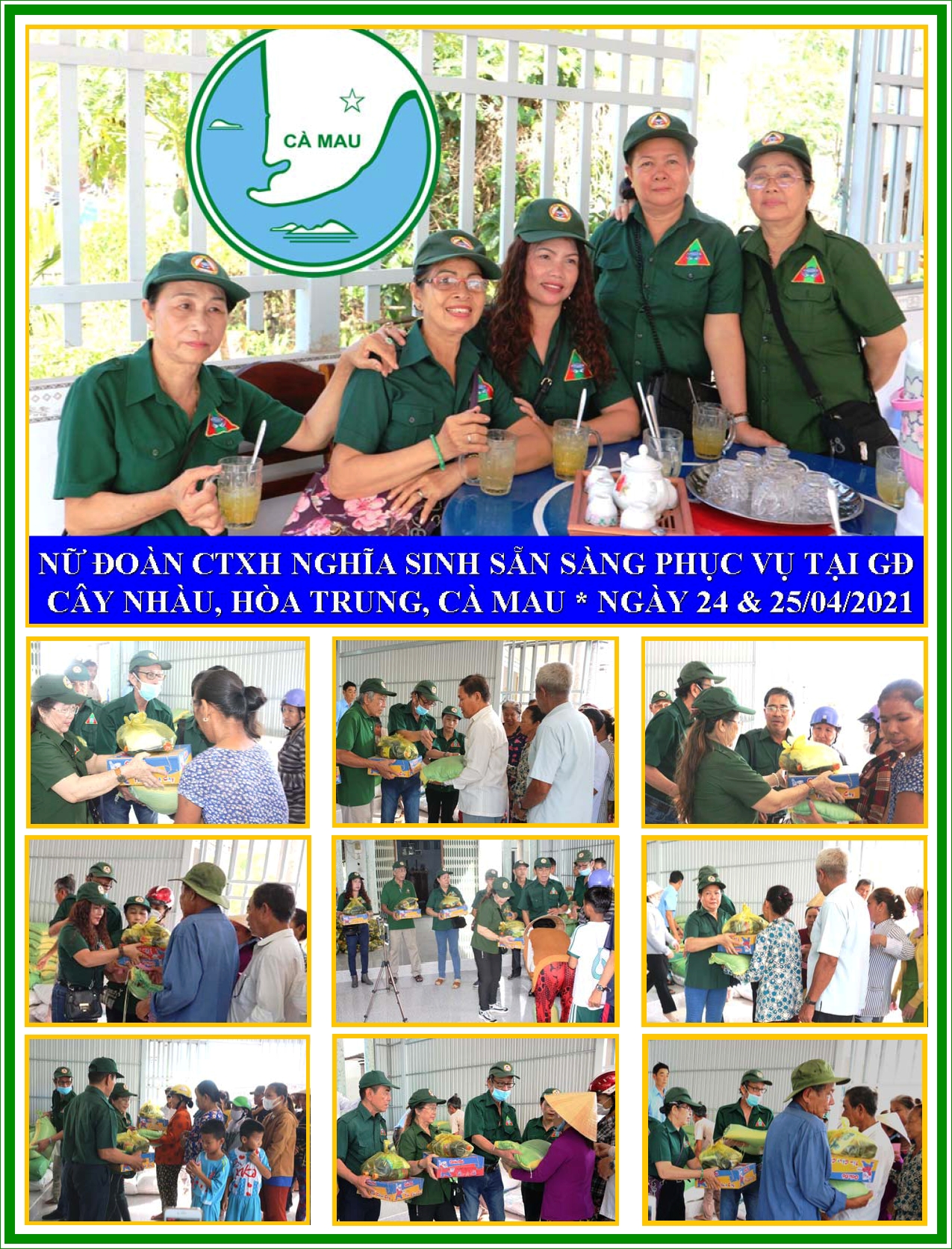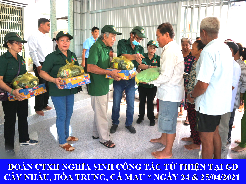 Địa điểm Đoàn CTXH Nghĩa Sinh đến phục vụ trong chuyến công tác nầy là Cù lao Cây Nhàu thuộc ấp Hòa Trung, xã Hòa Thành, tỉnh Cà Mau. Tại đây, đa số dân nghèo sống bằng nghề làm ruộng, trồng rau quả và có đời sống khiêm tốn, nhiều lúc phải cơ cực. Còn những người miền rừng cấm và vùng nước mặn thường sống bằng nghề đốn củi, chằm lá, bắt cua, giăng lưới hay đánh cá. Trong tinh thần “lá lành đùm lá rách”, Đoàn đã lần lượt trao tặng 100 phần quà cho người đại diện các hộ nghèo bao gồm gạo, nước mắm, mì gói và các nhu yếu phẩm khác.
