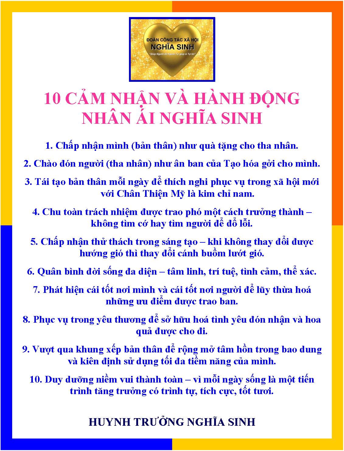 Đại đa số các Trưởng và Nghĩa Sinh tham gia chuyến công tác nầy đều đã gia nhập Nghĩa Sinh cách nay hơn 50 năm – đã hơn nửa thế kỷ phục vụ đồng hương, đồng bào và đồng loại trong tinh thần thiện nghĩa và hoàn toàn tự nguyện – rất đáng trân trọng và khâm phục. Mười (10) Hành động Nhân ái của Nghĩa Sinh đã được các thành viên trân trọng và nghiêm túc thực hiện trong hơn 58 năm qua (1963-2021) như sau: