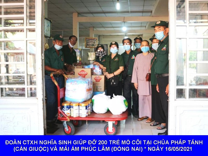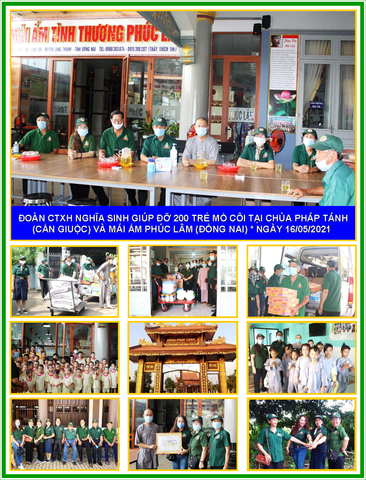 Vào sáng ngày 16/05/2021, Đoàn CTXH Nghĩa Sinh đã đến Chùa Pháp Tánh (Cần Giuộc, Long An) để thăm hỏi và trao tặng quà cho gần 100 em cô nhi đang được Mái ấm Tình thương Pháp Tánh nuôi dưỡng và giáo dục. Mỗi phần quà cho trẻ mồ côi gồm có dụng cụ học sinh và nhu yếu phẩm – với tổng giá trị 15.000.000 VNĐ. Vào chiều ngày 16/05/2021, Đoàn CTXH Nghĩa Sinh đã đến Mái ấm Tình thương Phúc Lâm tại Long Thành (Đồng Nai) để thăm hỏi và trao tặng quà cho hơn 100 em cô nhi đang được nuôi dưỡng và giáo dục tại trung tâm nầy. Mỗi phần quà cho trẻ mồ côi gồm có dụng cụ học sinh và nhu yếu phẩm như gạo, mỳ, sữa, dầu ăn – với tổng giá trị 15.000.000 VNĐ.