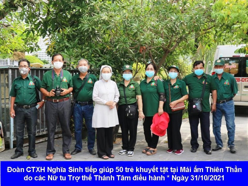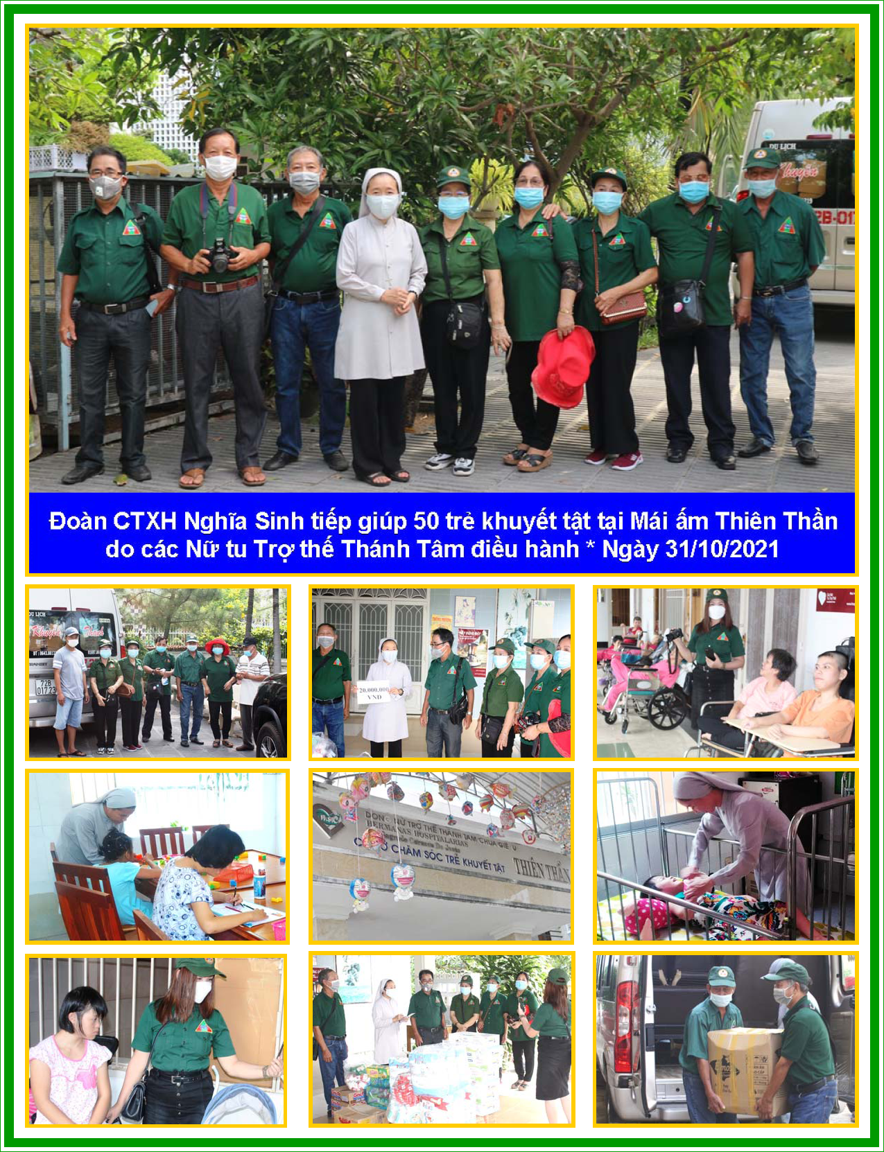 Vào sáng sớm ngày 31/10/2021, xe chở Đoàn Nghĩa Sinh đã khởi hành và trực chỉ xã Đông Hải, huyện Tân Thành, tỉnh Bà Rịa để tới Mái ấm Khuyết tật Thiên Thần do các nữ tu Công giáo điều hành. Mái ấm Khuyết tật Thiên Thần là nơi đã và đang nuôi dưỡng hơn 50 trẻ em khuyết tật, bị bại não, thần kinh và tâm thần. Các trẻ khuyết tật đã rất may mắn được các nữ tu Trợ thế Thánh Tâm tận tình nuôi dưỡng và hết lòng chăm sóc sức khỏe cho các em ngày đêm.... Đoàn Nghĩa Sinh đã đến tiếp tay với quý Soeurs trong việc dưỡng dục những trẻ mồ côi khuyết tật đáng thương – không cha không mẹ, không người ủi an – và lại phải chào đời không được lành lặn vì khuyết tật và vì bệnh tật bẩm sinh. Trong tinh thần “Lá lành đùm lá rách” và “Bầu ơi thương lấy Bí cùng”, các anh chị Nghĩa Sinh đã ân cần tới thăm hỏi, an ủi và tặng quà cho các em đang được các Soeurs ân cần nuôi dưỡng ngày đêm tại đây...Dù gặp nhiều khó khăn trở ngại vì đại dịch Covid, Đoàn Nghĩa Sinh vẫn quyết tâm lên đường tiếp giúp các em khuyết tật tại Mái ấm Thiên Thần và hỗ trợ các em mồ côi tại Chùa Hộ Pháp