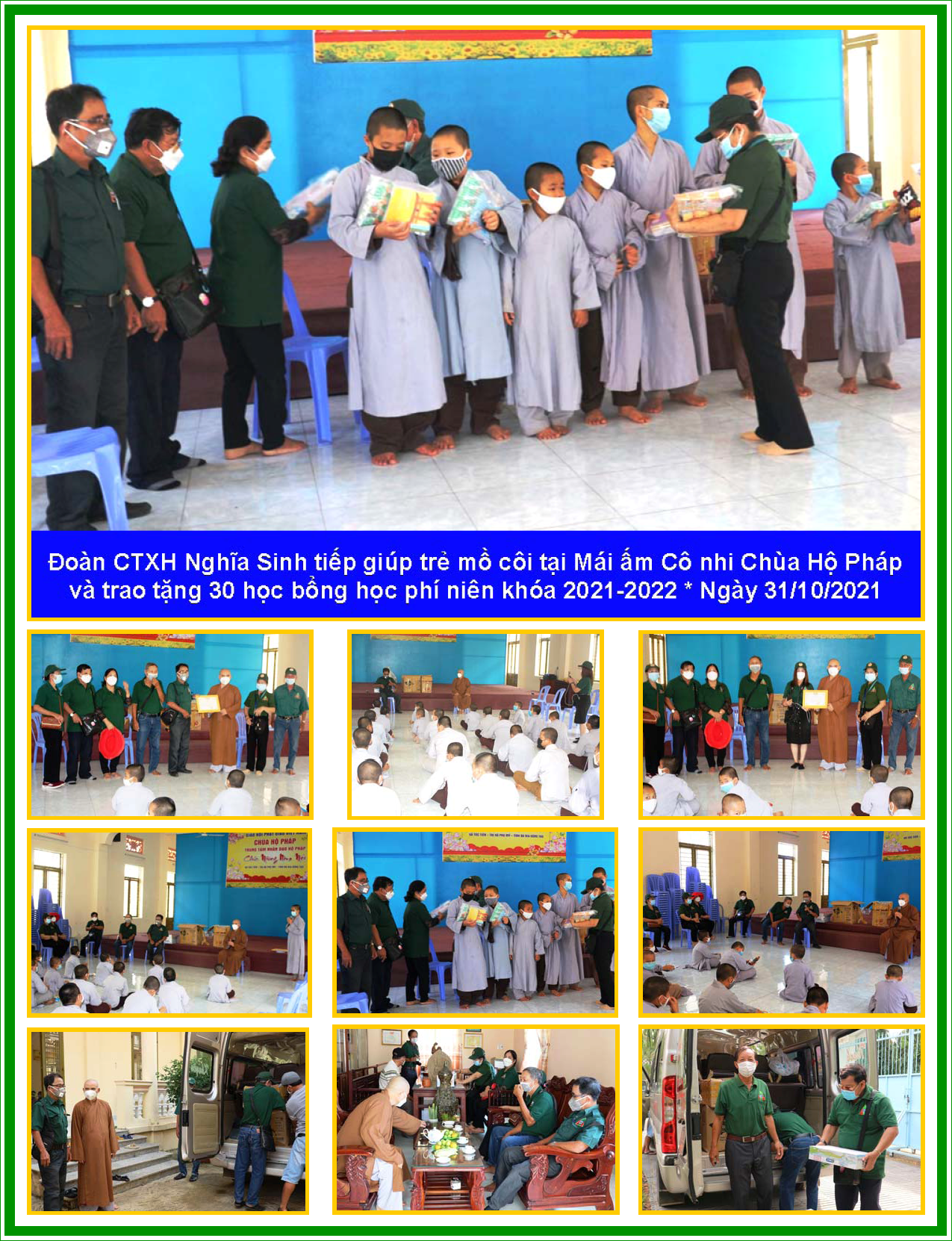 Đáp lời kêu gọi của Trung tâm Nhân đạo Chùa Hộ Pháp nơi cần sự hỗ trợ của bà con người Việt tiếp giúp 30 học sinh mồ côi có tiền trả học phí và mua học cụ (như tập vở, bút giấy, cặp đựng sách), vào chiều ngày 31/10/2021, Đoàn CTXH Nghĩa Sinh – với sự hỗ trợ quảng đại của quý ân nhân Nghĩa Sinh – đã đến trao tặng 30 học bổng cho các em học sinh mồ côi tại Chùa Phật giáo Hộ Pháp (với tổng trị giá khiêm tốn là 33 triệu VNĐ).