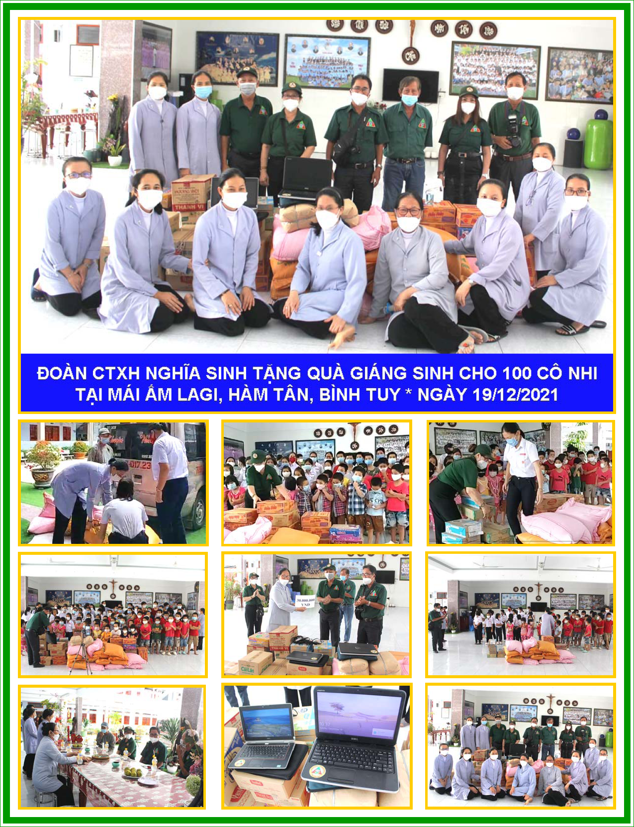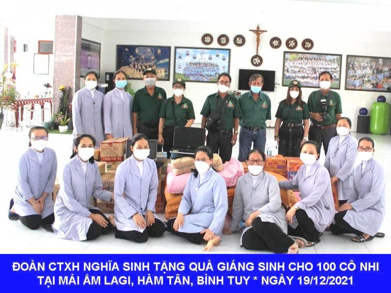 Nhân dịp Giáng Sinh 2021, Đoàn Công tác Xã hội Nghĩa Sinh đã đến Mái ấm Tình Thương La Gi để thăm hỏi, ủi an và tặng quà Giáng Sinh cho hơn 100 trẻ mồ côi hiện đang được các Soeurs giúp đỡ tại cơ sở xã hội bác ái nầy. Đoàn cũng đã gửi tặng 700 kg gạo và các nhu yếu phẩm khác như sữa, đường, dầu ăn… Đặc biệt trong chuyến công tác nầy, Đoàn đã gửi tặng Mái ấm Tình Thương 2 máy vi tính để dùng cho các lớp học trong trường hợp các em cô nhi phải học trực tuyến tại nhà vì đại dịch COVID (tổng thể là 30 triệu VNĐ).