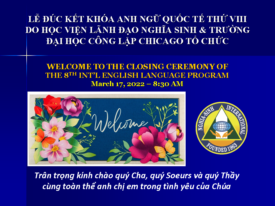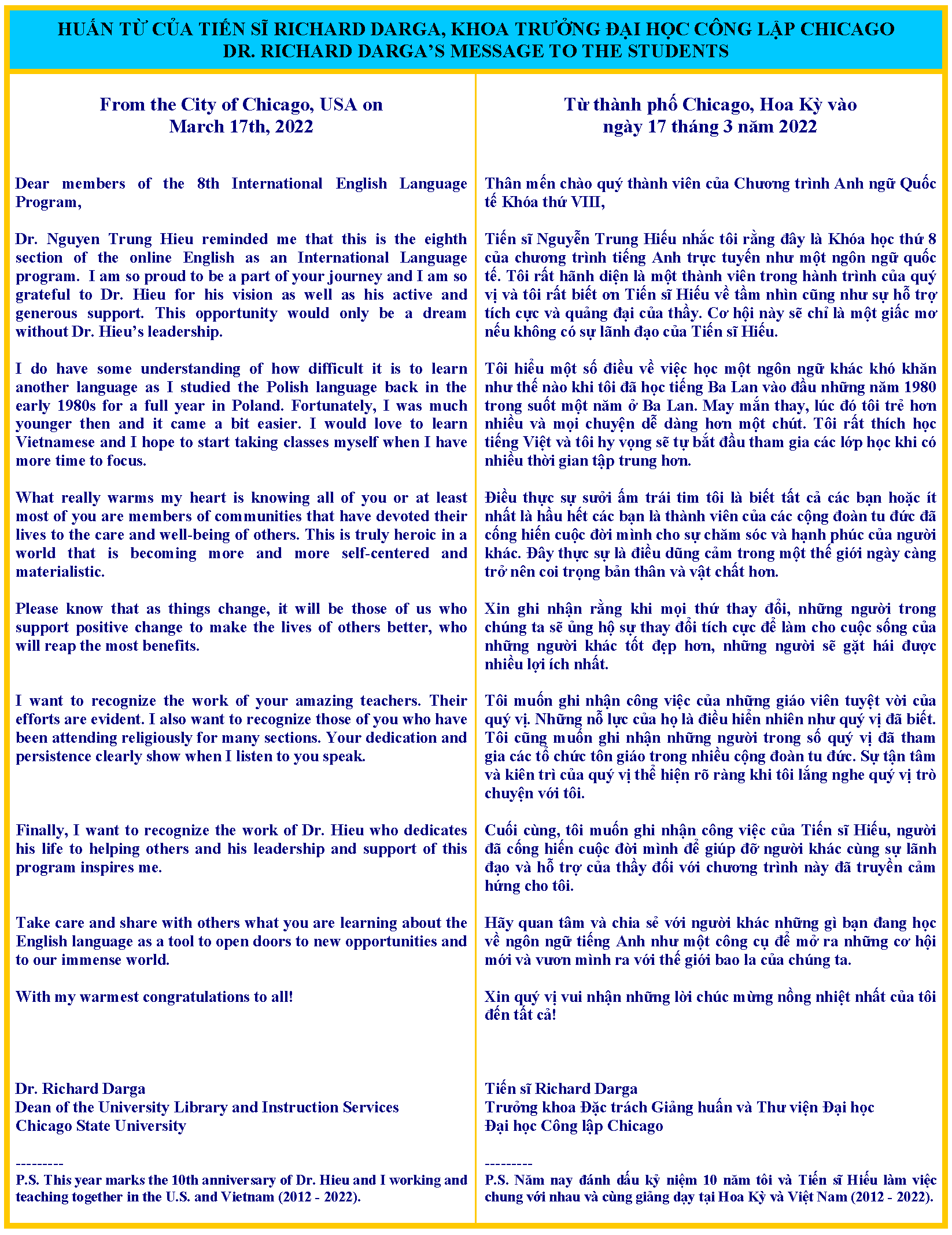 Vào lúc 8 giờ 30 ngày 17/03/2022, Khoa trưởng Đại học Công lập Chicago, Tiến sĩ Richard Darga, đã đến chủ tọa Lễ Đúc kết Khóa Anh ngữ Quốc tế Thứ VIII được tổ chức trực tuyến từ Chicago. Hiện diện trong lễ đúc kết có 25 linh mục, tu sĩ, huynh trưởng và giáo lý viên tham dự Khóa Anh ngữ Quốc tế nầy.