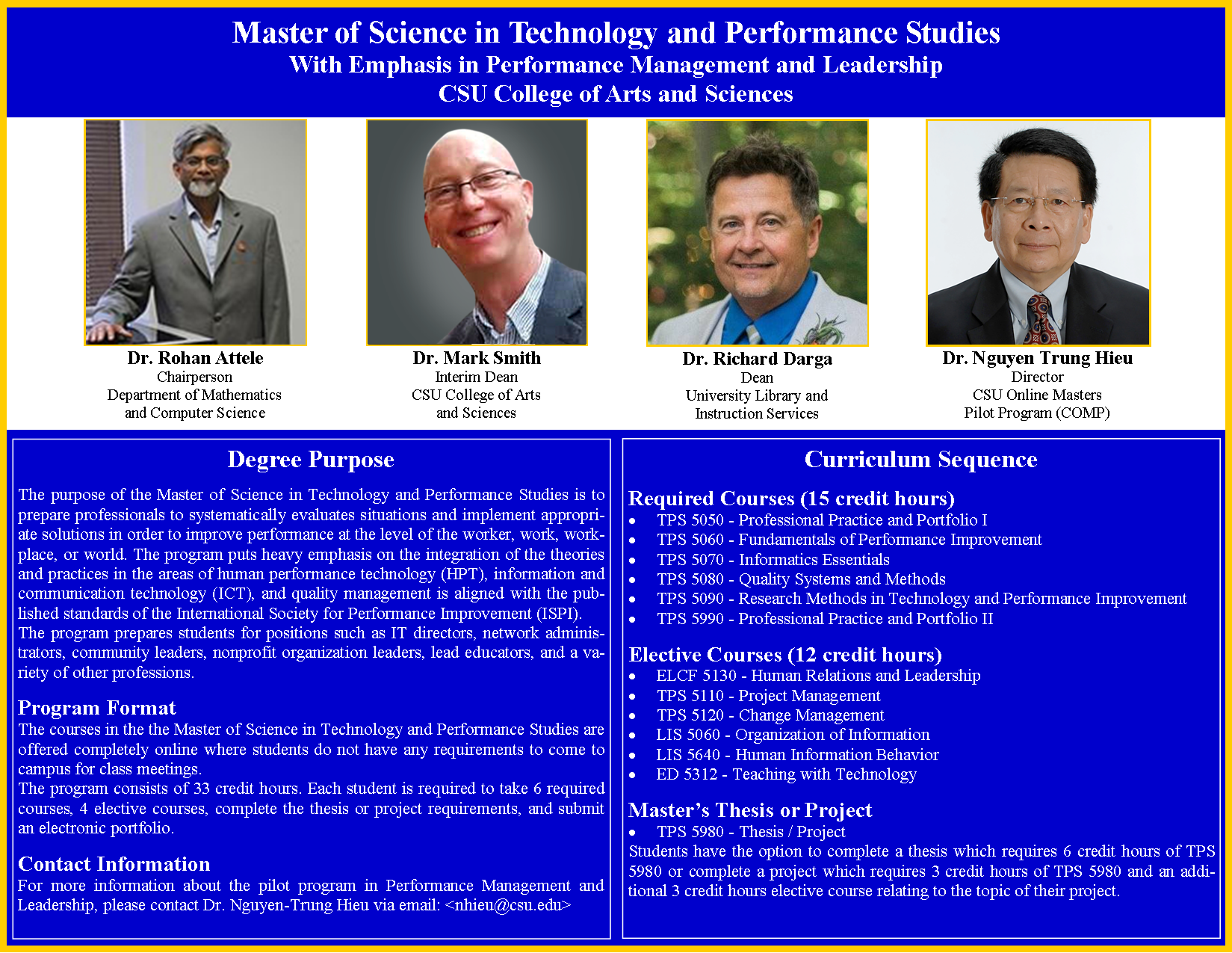 Sau khi thi IELTS được 6.0 điểm hoặc cao hơn, học viên các lớp Anh ngữ sẽ được nhập học chương trình thạc sĩ với học bổng học phí (tuition scholarships or tuition waivers). Nội dung chương trình Thạc sĩ Khoa học TPS chuyên luyện về Quản trị và Lãnh đạo (Master of Science in TPS with emphasis in Management and Leadership) được tóm lược như sau.