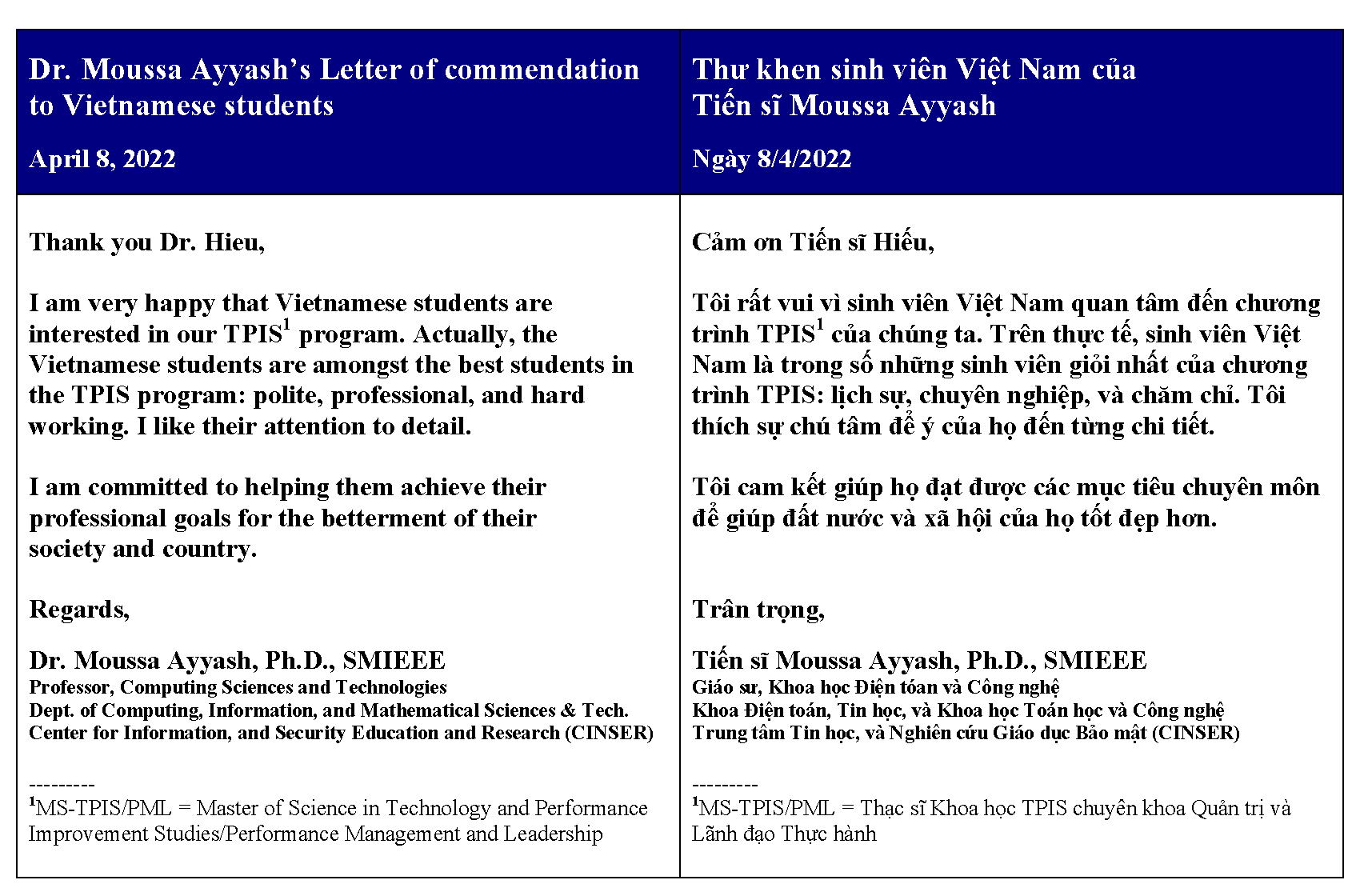 Ngày 8/4/2022 vừa qua, Tiến sĩ Moussa Ayyash đã gửi Thầy Nguyễn Trung Hiếu một văn thư khen ngợi các sinh viên Việt Nam. Đội ngũ sinh viên Việt Nam được khen ngợi trong dịp nầy gồm có quý Linh mục, Tu sĩ và các Huynh trưởng. Nguyên văn nội dung thư khen ngợi của Giáo sư Chủ nhiệm như sau:Học viện Nghĩa Sinh: Thư khen ngợi quý Linh mục, Tu sĩ và các Huynh trưởng của Giáo sư Chủ nhiệm Chương trình Thạc sĩ Khoa học TPIS ngành Quản trị và Lãnh đạo