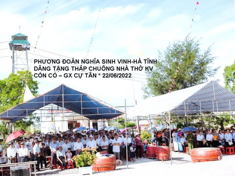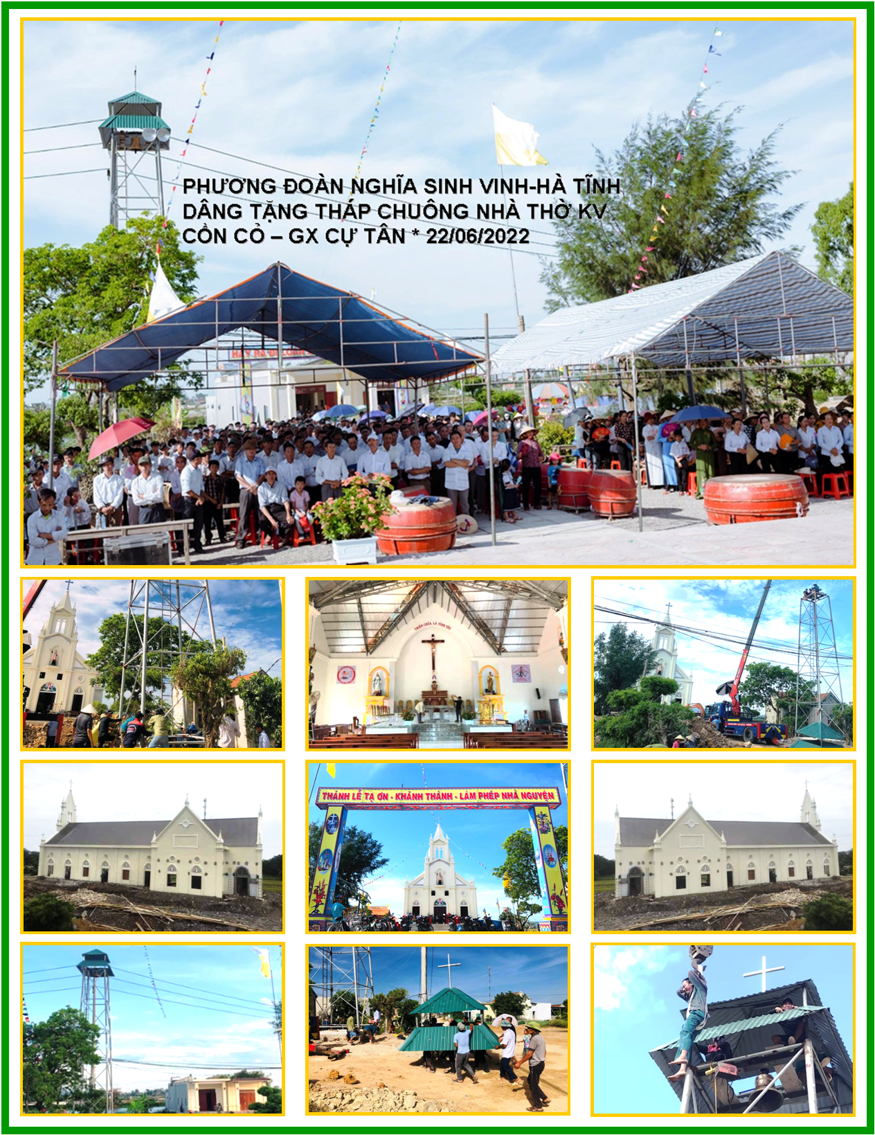 Đáp lời mời gọi của Cha Quản xứ, Phương đoàn Nghĩa Sinh Giáo phận Vinh – Hà Tĩnh đã hợp tác với quý Ân nhân Nghĩa Sinh Saigon và Chicago trong công tác gây quỹ xây dựng tháp chuông nhà thờ Khu vực Cồn Cỏ. Sau gần 3 tháng tích cực hoạt động, từ cuối tháng Ba đến giữa tháng Sáu năm 2022, Đoàn đã tiếp nhận được 46,700,000 VNĐ – là ngân quỹ xây dựng quyên góp được từ quý Ân nhân Nghĩa Sinh Vinh, Hà Tĩnh, Sài Gòn và Chicago. Đoàn đã nhờ Cha Bernard, Quản lý Tòa Giám mục Giáo phận Vinh trao ngân khoản khiêm tốn này tới Giáo xứ Cự Tân.