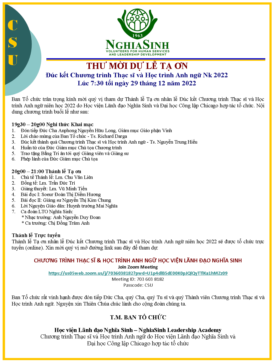 Học viện Nghĩa Sinh trân trọng thông báo lễ Đúc kết Chương trình Thạc sĩ Khoa học Quản trị & Lãnh đạo và Học trình Anh ngữ Chuyên ngành Đại học dành riêng cho quý linh mục, tu sĩ, huynh trưởng và giáo lý viên trong niên học 2022 sẽ được tổ chức lúc 19 giờ 30 ngày 29/12/2022. Ban Tổ chức lễ Đúc kết Thành quả Giáo dục rất vinh hạnh được đón tiếp Đức Giám mục Anphong Nguyễn Hữu Long tới chủ tọa và ban huấn từ.