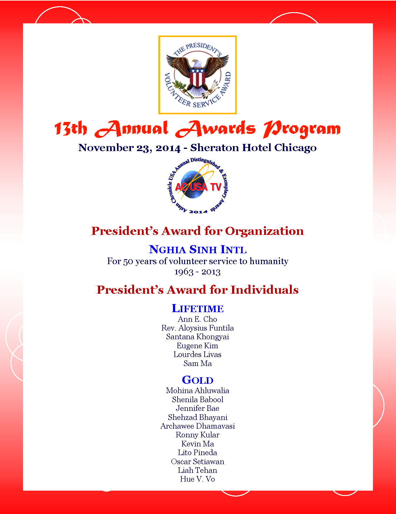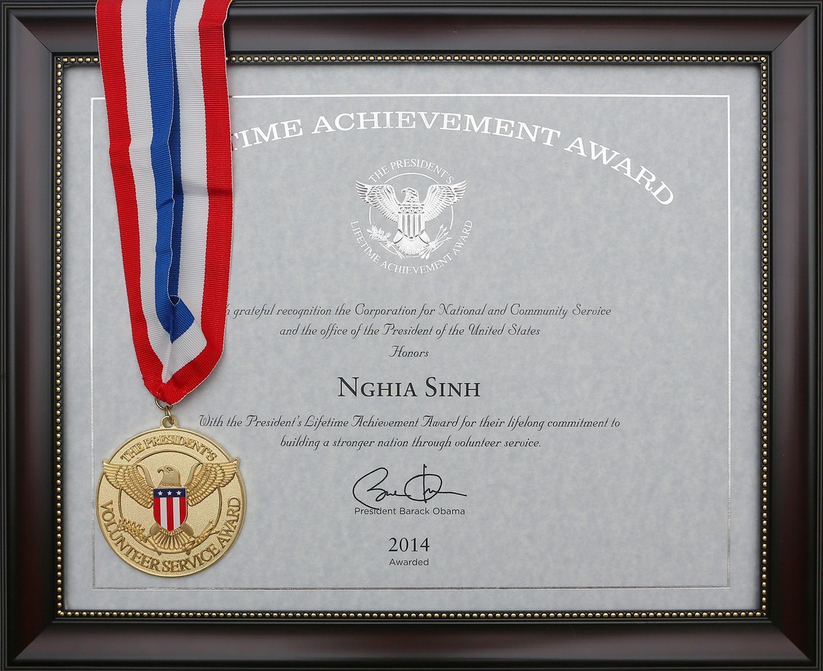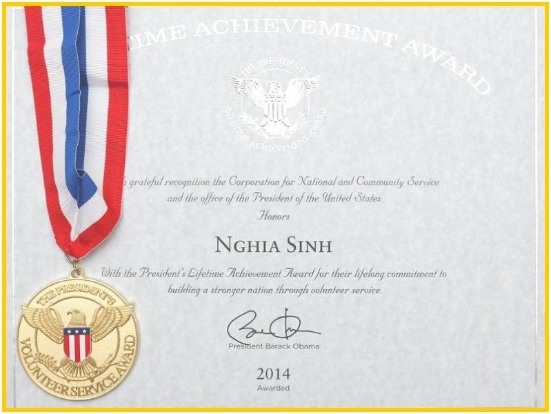 Nội dung bằng tưởng thưởng: “Để ghi nhận lòng biết ơn, Cơ Quan Phục Vụ Cộng Đồng và Quốc Gia cùng với Văn Phòng Tổng Thống Hoa Kỳ trân trọng trao tặng Nghĩa Sinh Bằng Tưởng Thưởng của Tổng Thống để vinh danh kết ước trường kỳ của tổ chức nầy trong việc xây dựng một quốc gia hùng mạnh hơn qua các công tác thiện nguyện.” Với chữ ký của Tổng Thống Barack Obama.