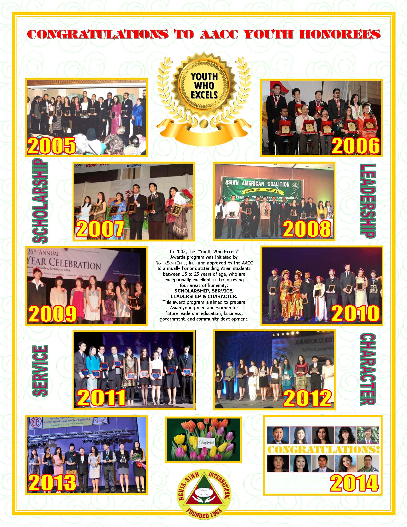 Giải thưởng Thanh Niên Ưu Tú do Huynh Trưởng Nghĩa Sinh thành lập ngày 29 tháng 9 năm 2004. Lễ phát thưởng đầu tiên được tổ chức ngày 26 tháng 2 năm 2005 tại hội trường Hyatt Regency O’Hare-Chicago. Từ đó, chương trình Giải thưởng Thanh Niên Ưu Tú đã được liên tục tổ chức trong 10 năm qua (2005-2015). Lễ phát thưởng lần thứ 11 được tổ chức ngày 28 tháng 2 năm 2015 tại hội trường Hyatt Regency O’Hare. Các thanh niên Á Châu từ các cộng đồng sau đây đã được tuyển chọn nhận giải thưởng năm nay:
