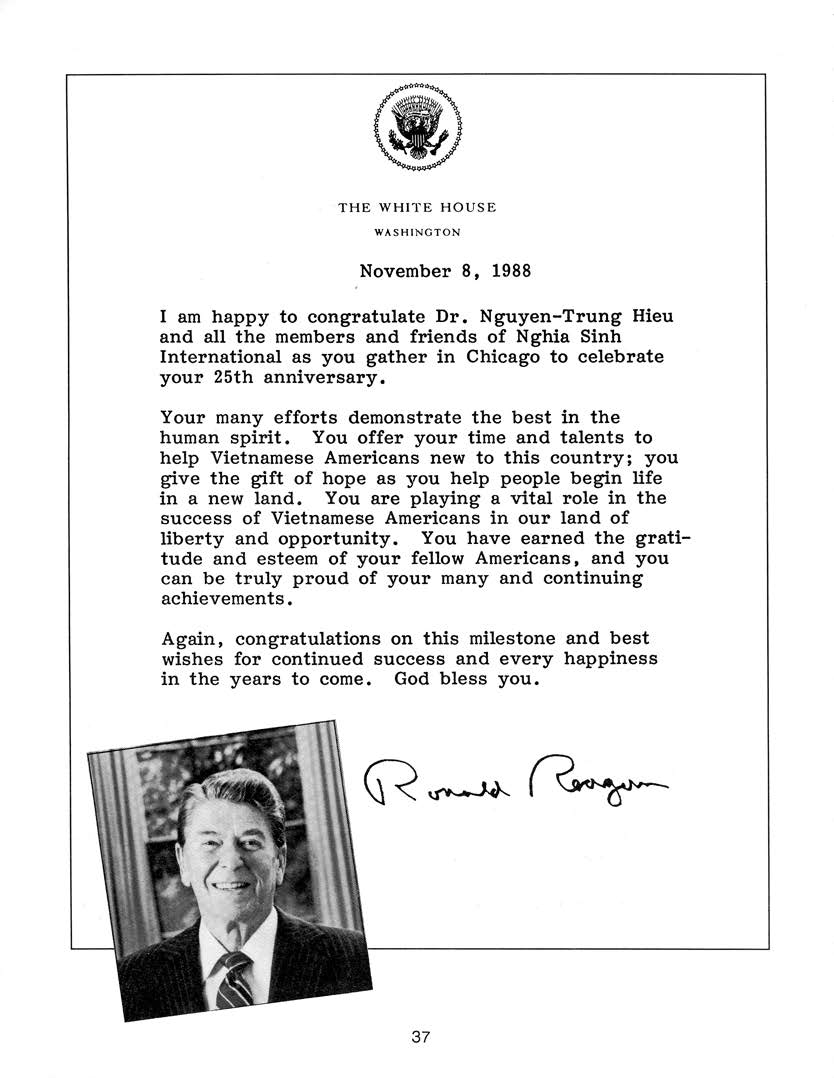 1 Tổng Thống Ronald Reagan gửi thư chúc mừng Sinh nhật năm thứ 25 của Nghĩa Sinh * 1963-1988.